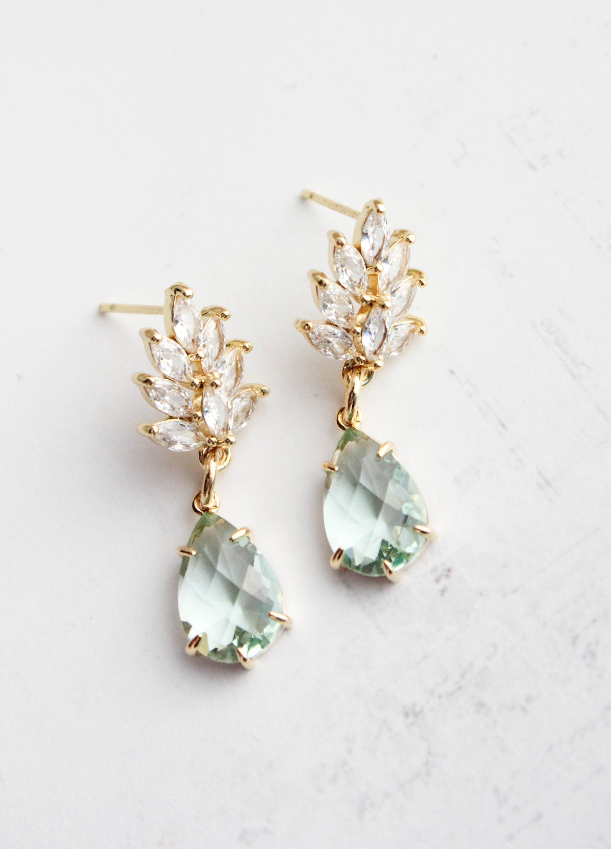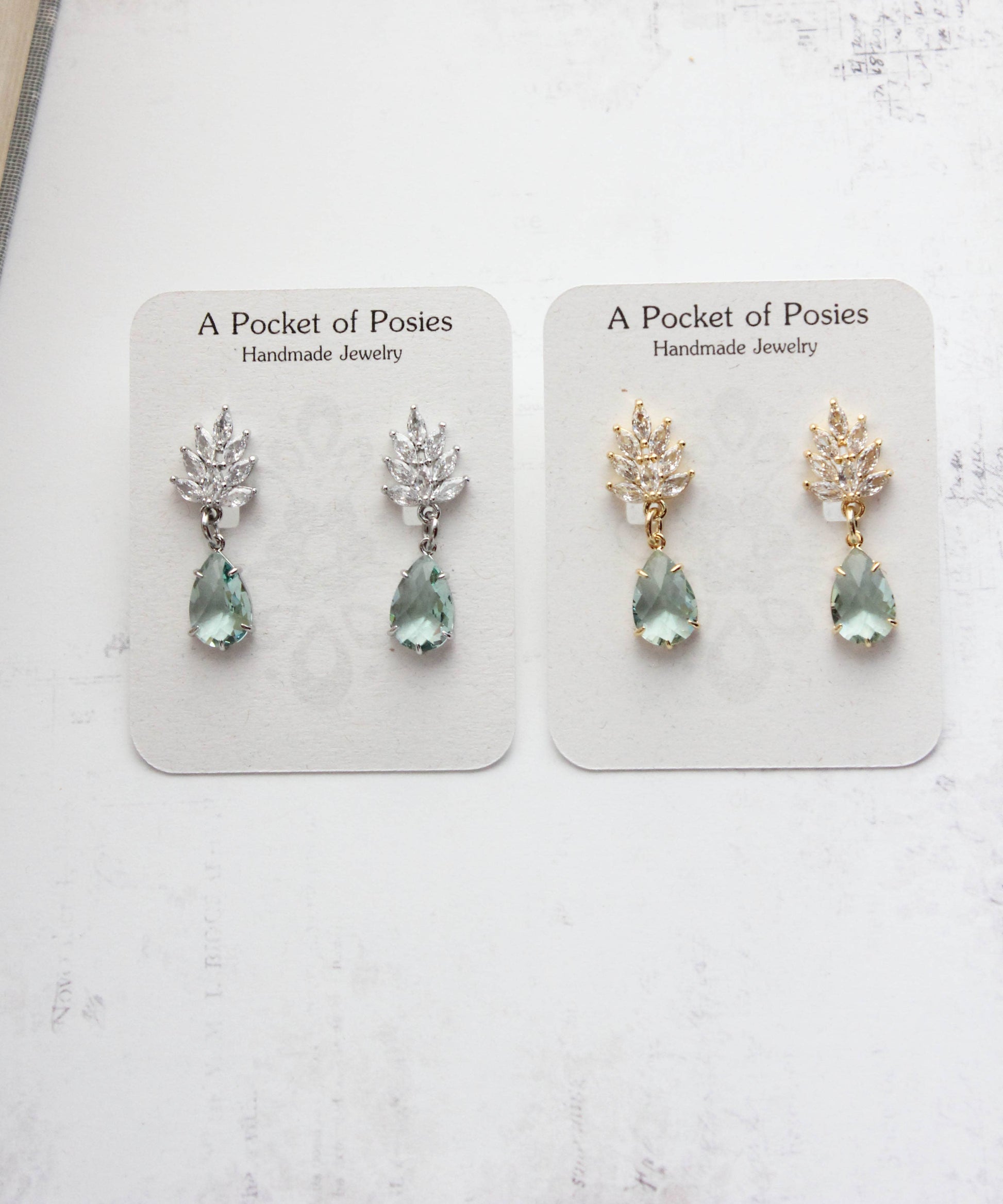 These are beautiful sparkling rhinestone stud earrings! The front of the post setting is sparkling cubic zirconia leaves and below drops the faceted aqua glass jewel teardrops in their glossy prong setting. Choose from gold or silver settings.