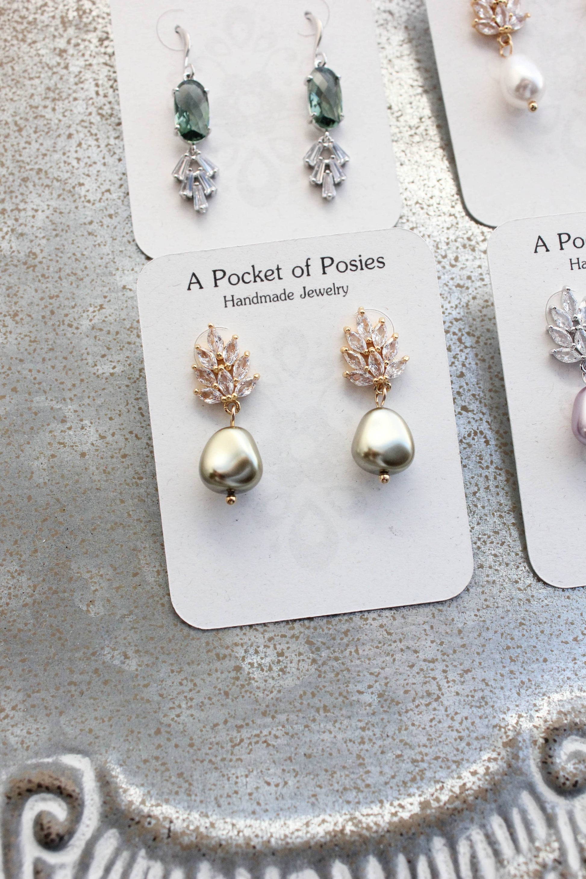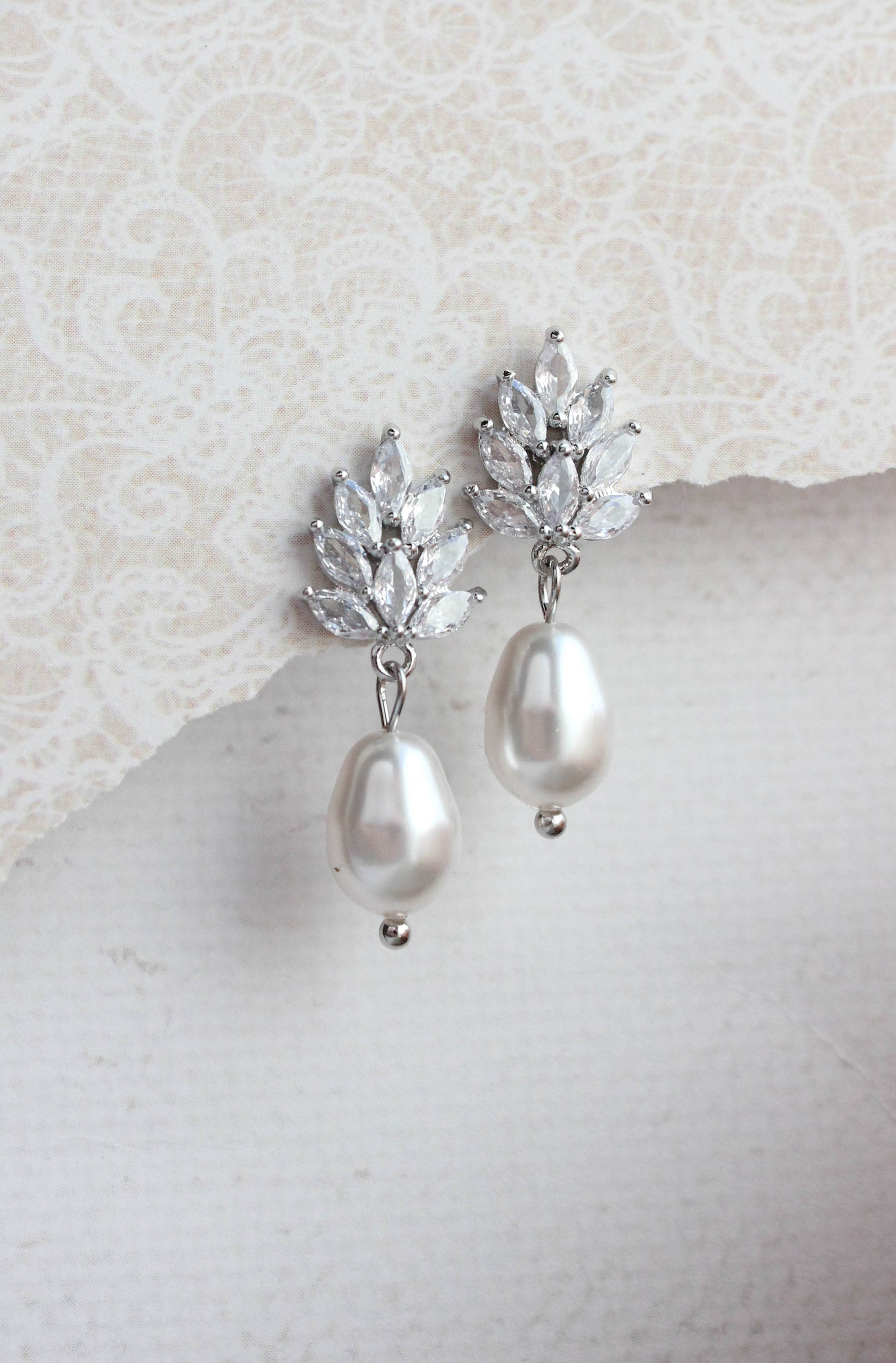 These are beautiful sparkling post earrings! The posts are sparkling cubic zirconia leaves and below drops a swarovski glass pearl.