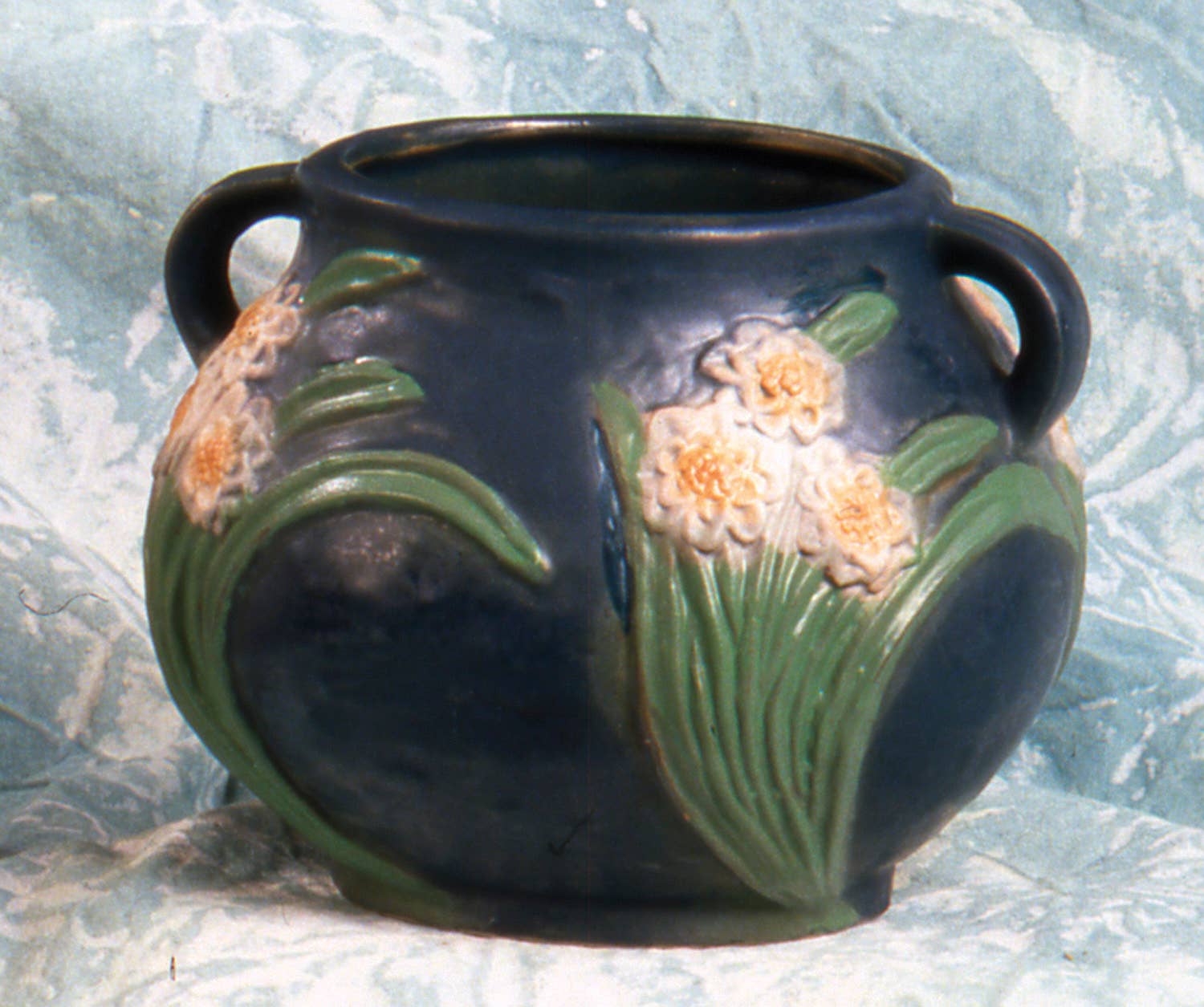Blue Rosevile-style basket featuring a raised primrose design on the side.