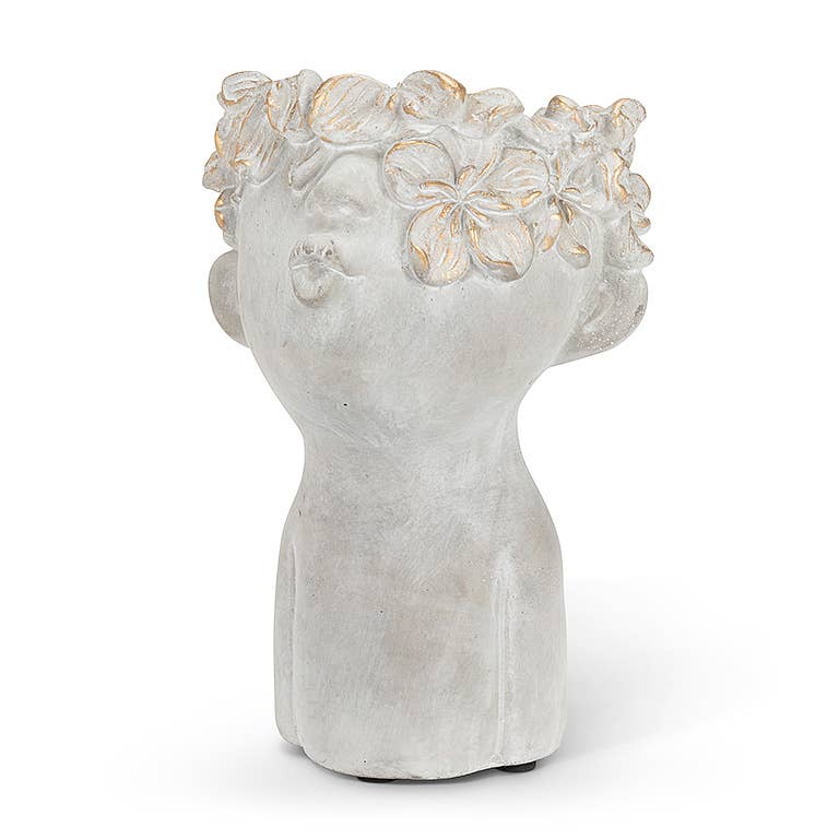 Add a kiss of decorative delight to your favourite plant or flowers with this charming Large Kissing Face Planter. Crafted out of cement with a rustic weathered grey and gold finish, the neo-classical sculpt of this puckering cherub's lips, accented with a crown of flowers, makes a captivating complement to any type of plant or flowers.
