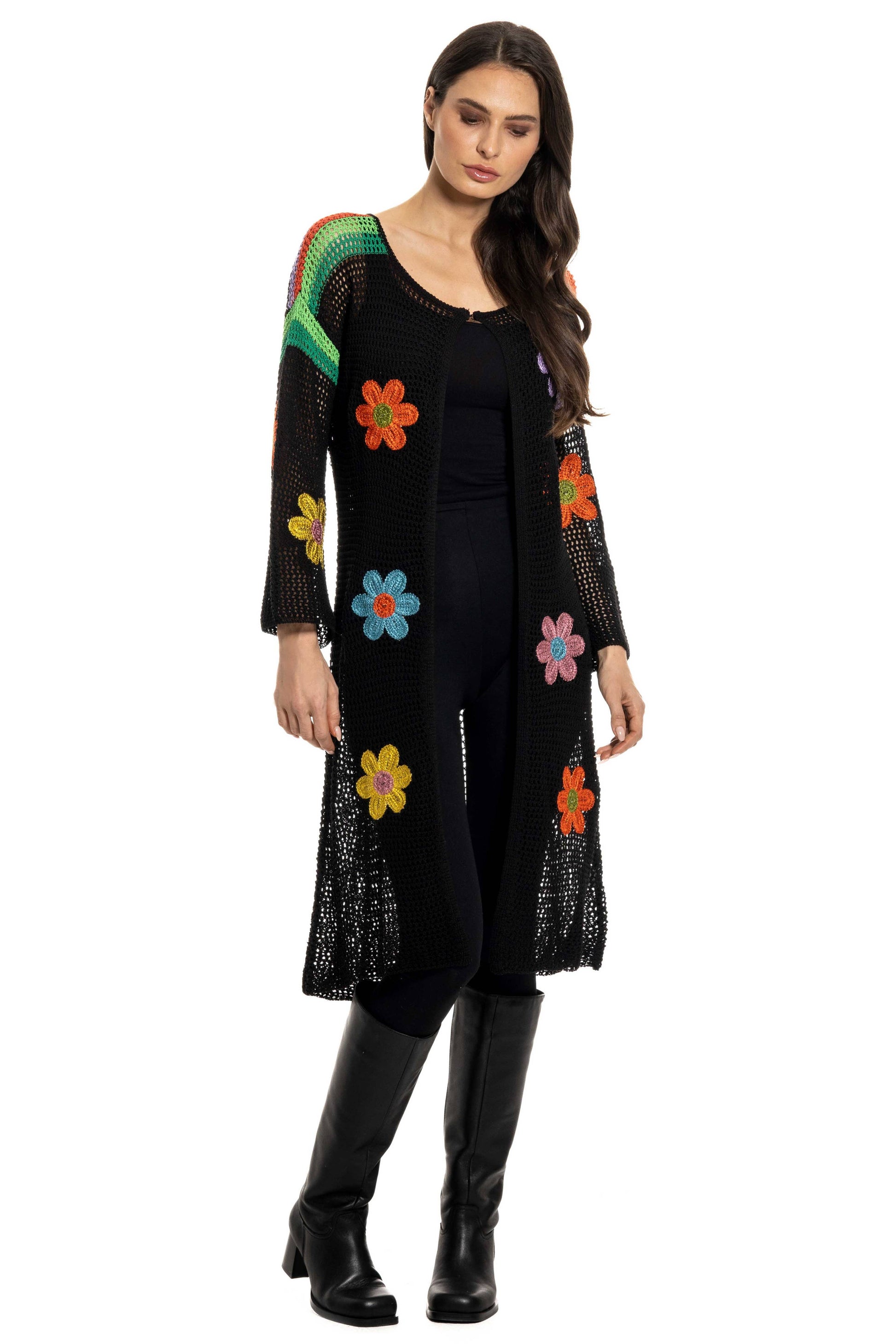 Make a bold statement with this vibrant crochet duster, featuring colorful oversized floral accents and intricate knit detailing. The open-front design and breezy silhouette make it a versatile layering piece for the season. Its playful blend of textures and colors creates a striking look that’s perfect for adding a pop of personality to your wardrobe.