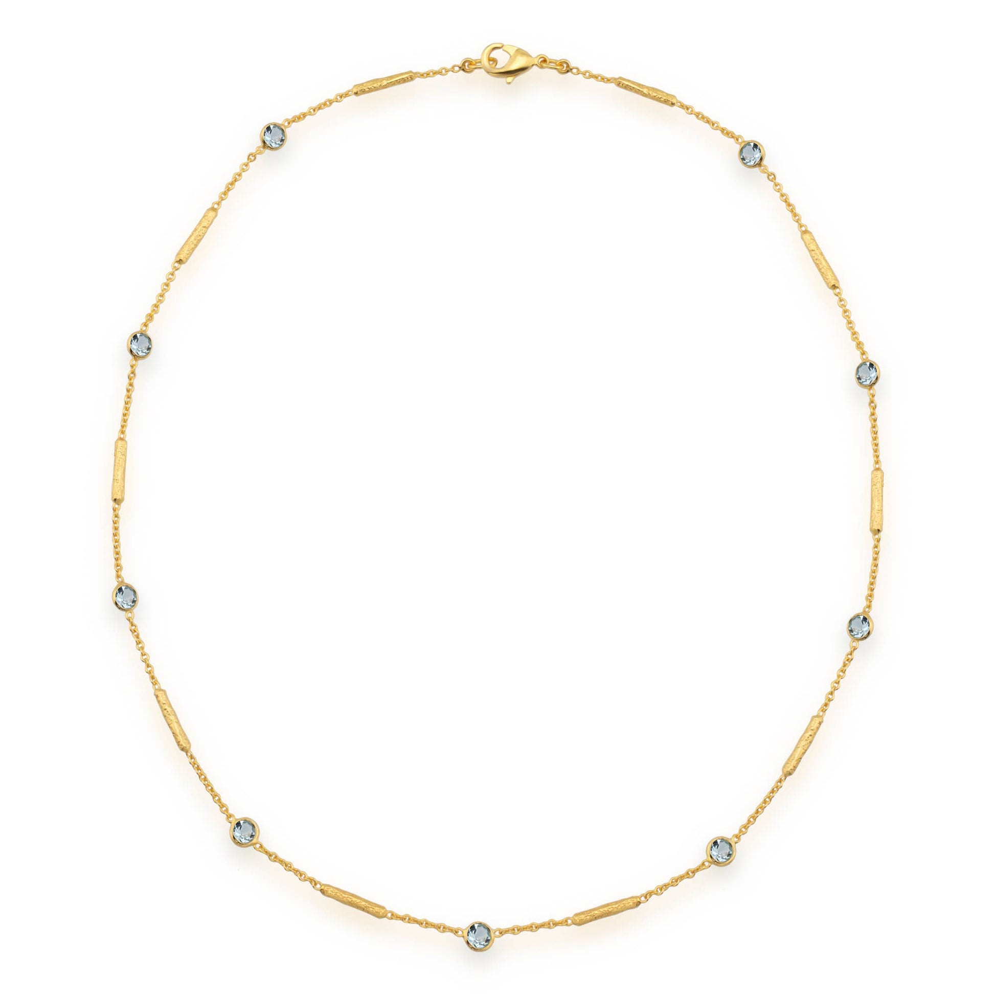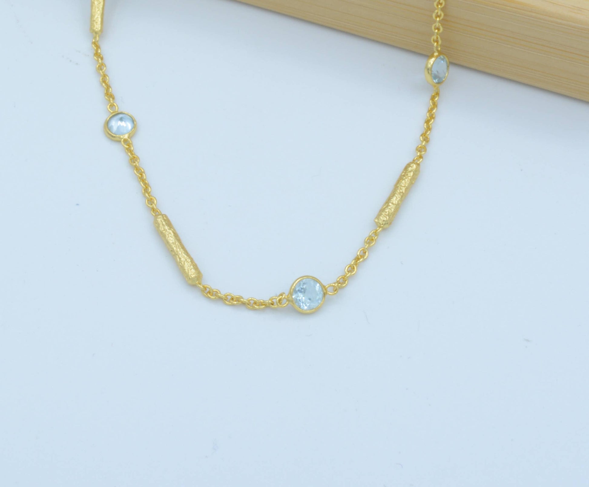 Introducing our lovely necklace featuring bezel-set blue topaz stones and textured tube spacers. Crafted from brass and plated with 18kt gold, this exquisite piece offers an adjustable chain, allowing you to wear it at 16", 17", or 18" for the perfect fit. Versatile and elegant, it is ideal for layering or wearing alone, making it a standout addition to any jewelry collection.