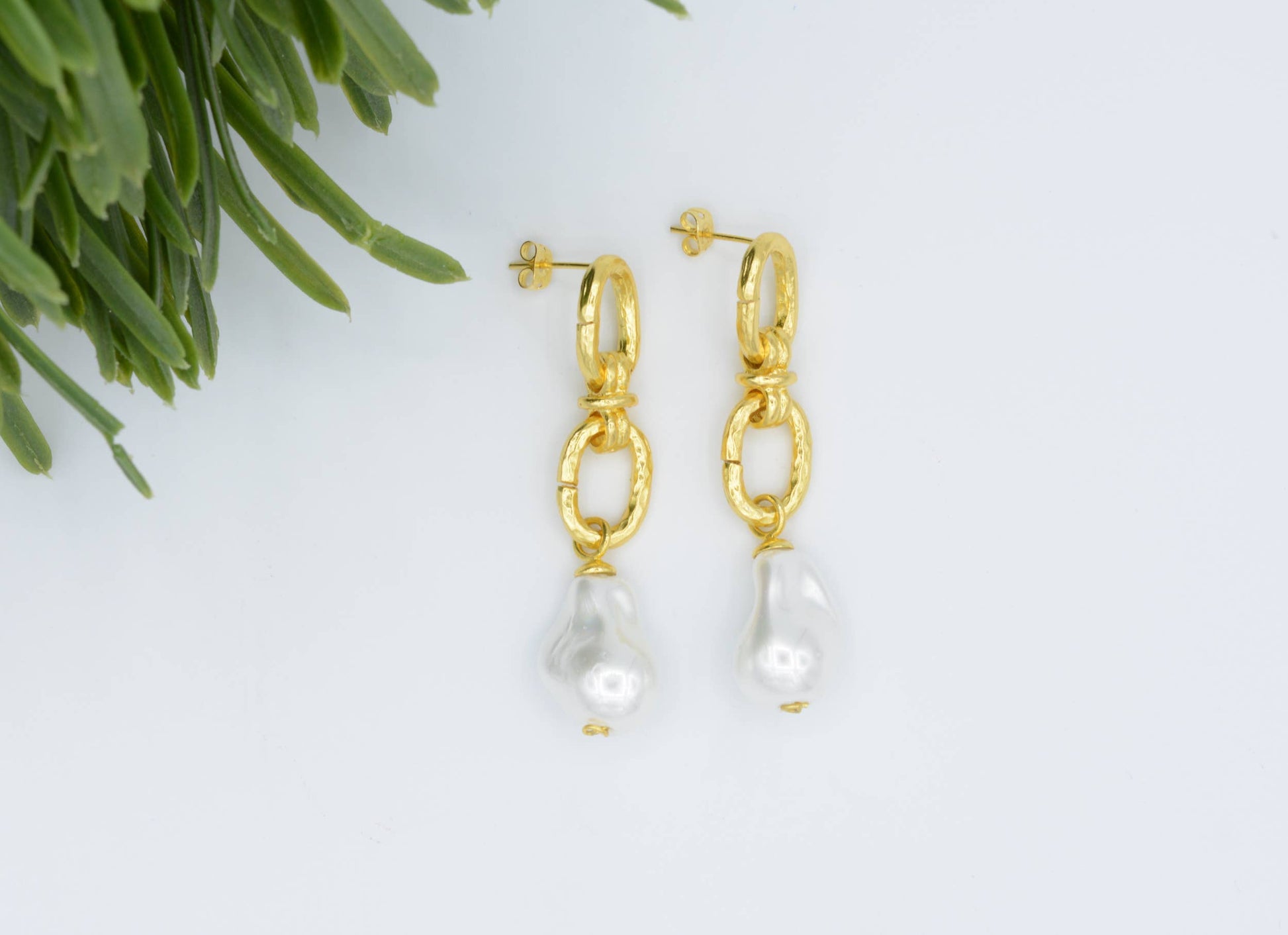 This design features two connected oval rings adorned with perfectly sized Baroque pearls. Crafted from our signature hand-hammered brass with a luxurious 22kt gold plating, each pearl is natural, so slight variations are to be expected. Measures approximately 2 1/2" in length.