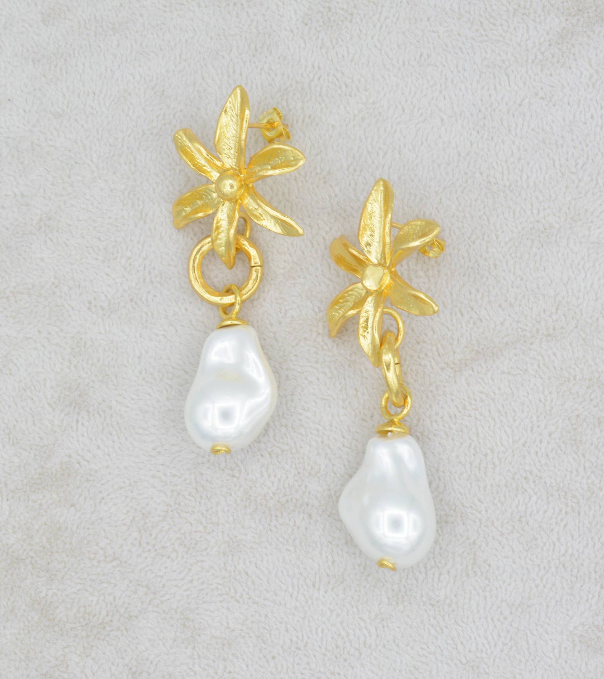 This favorite flower design is paired with a perfect Baroque pearl, crafted in brass with a luxurious 22kt gold plating. Each pearl is hand-selected and entirely natural, so slight variations are normal. Measures approximately 2 1/2" in length