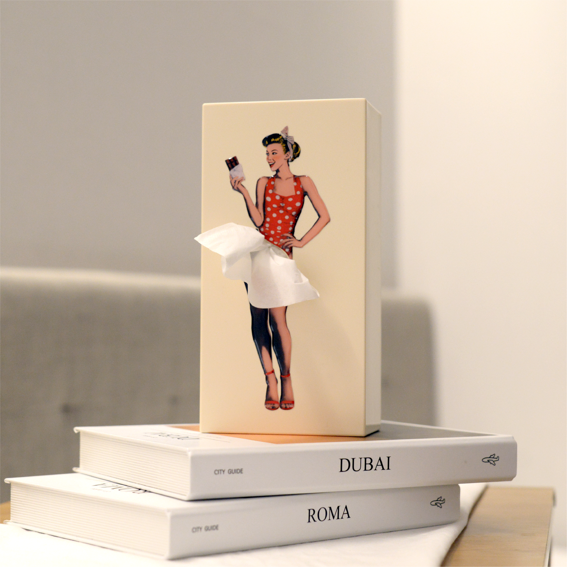 Every time you pull a tissue, the lady's skirt restyles itself like catching a gentle breeze.