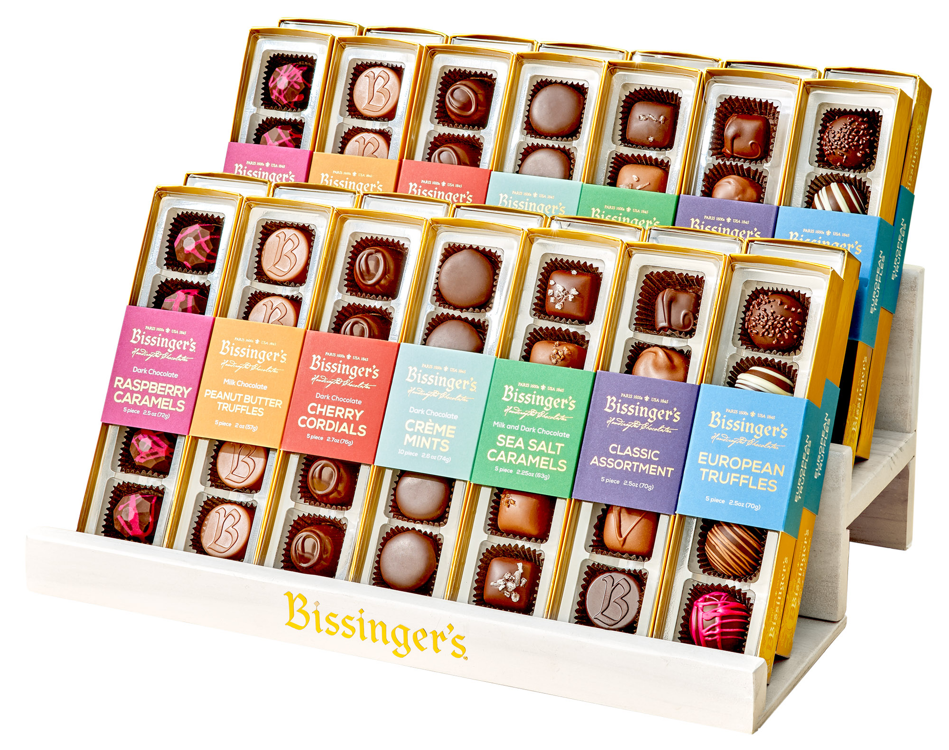 NEW! Bissinger's white metal fixture holds 4 cases of our Premium Chocolate Bars or 28 units of our NEW Chocolate Flights (as seen in photo)