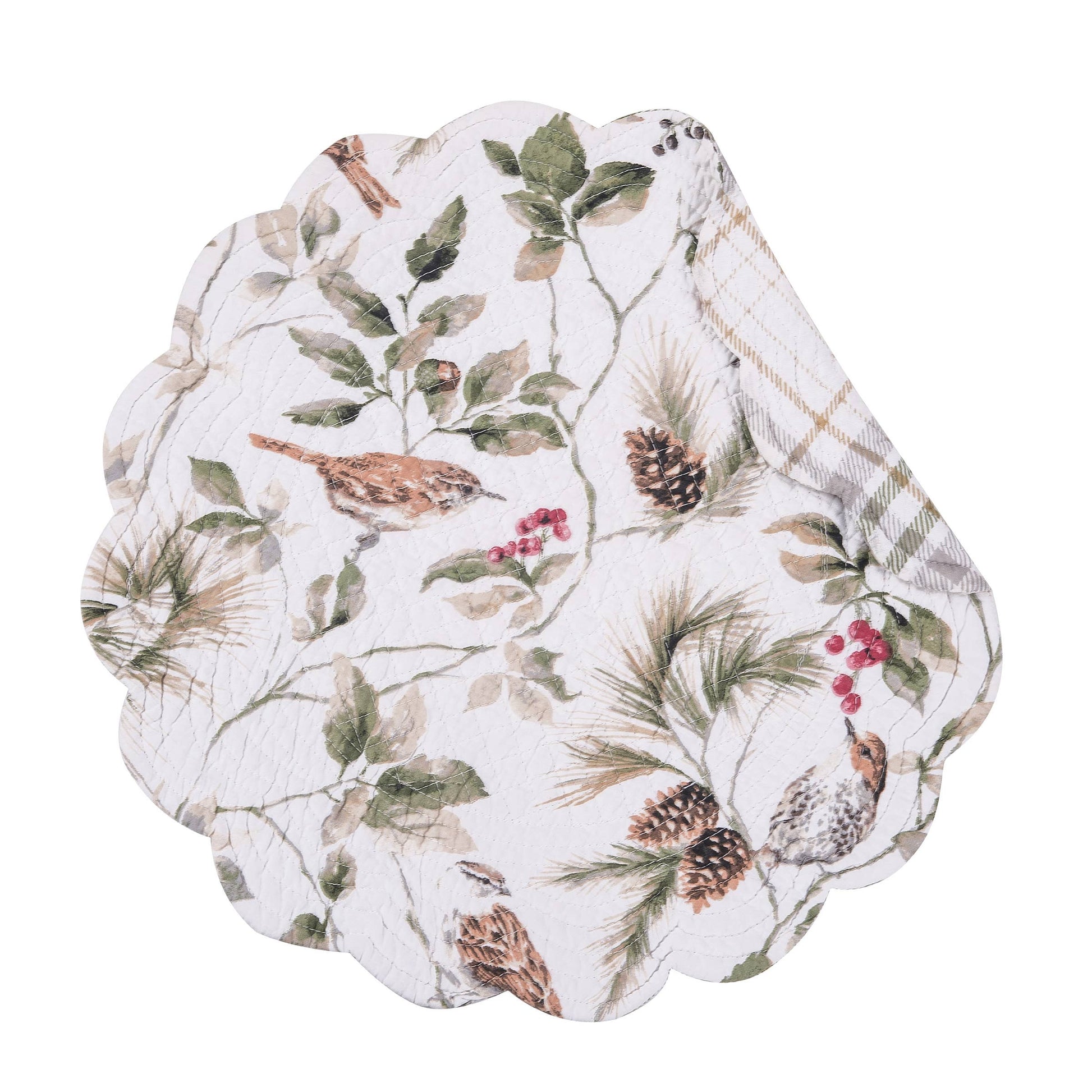 Brighten up your dining room with the Mira Songbird placemat. Featuring chickadees and wrens perched atop branches, this cotton placemat is sure to bring a fresh and cheerful vibe to your table. Reverses to a coordinating plaid for additional styling options.