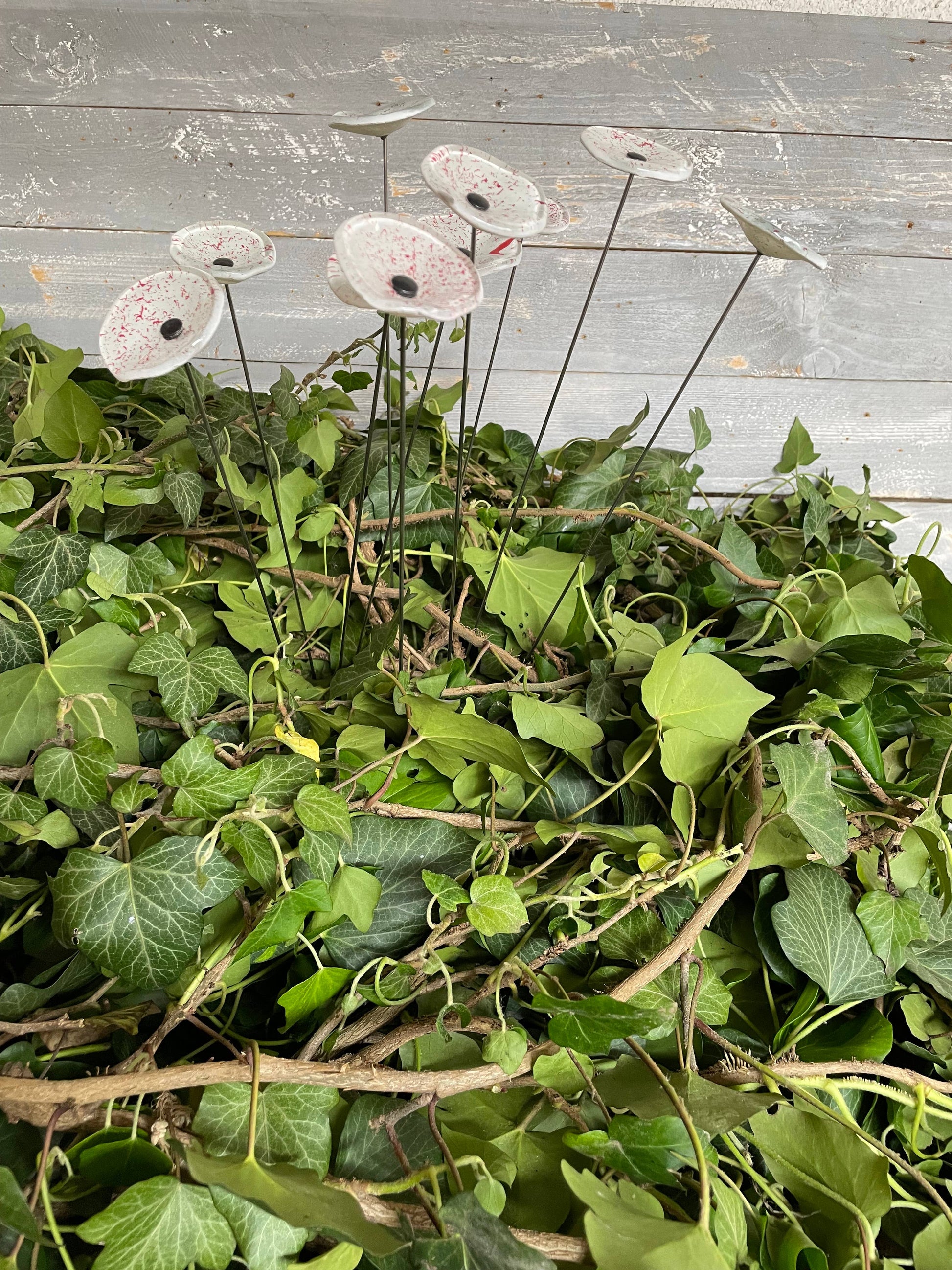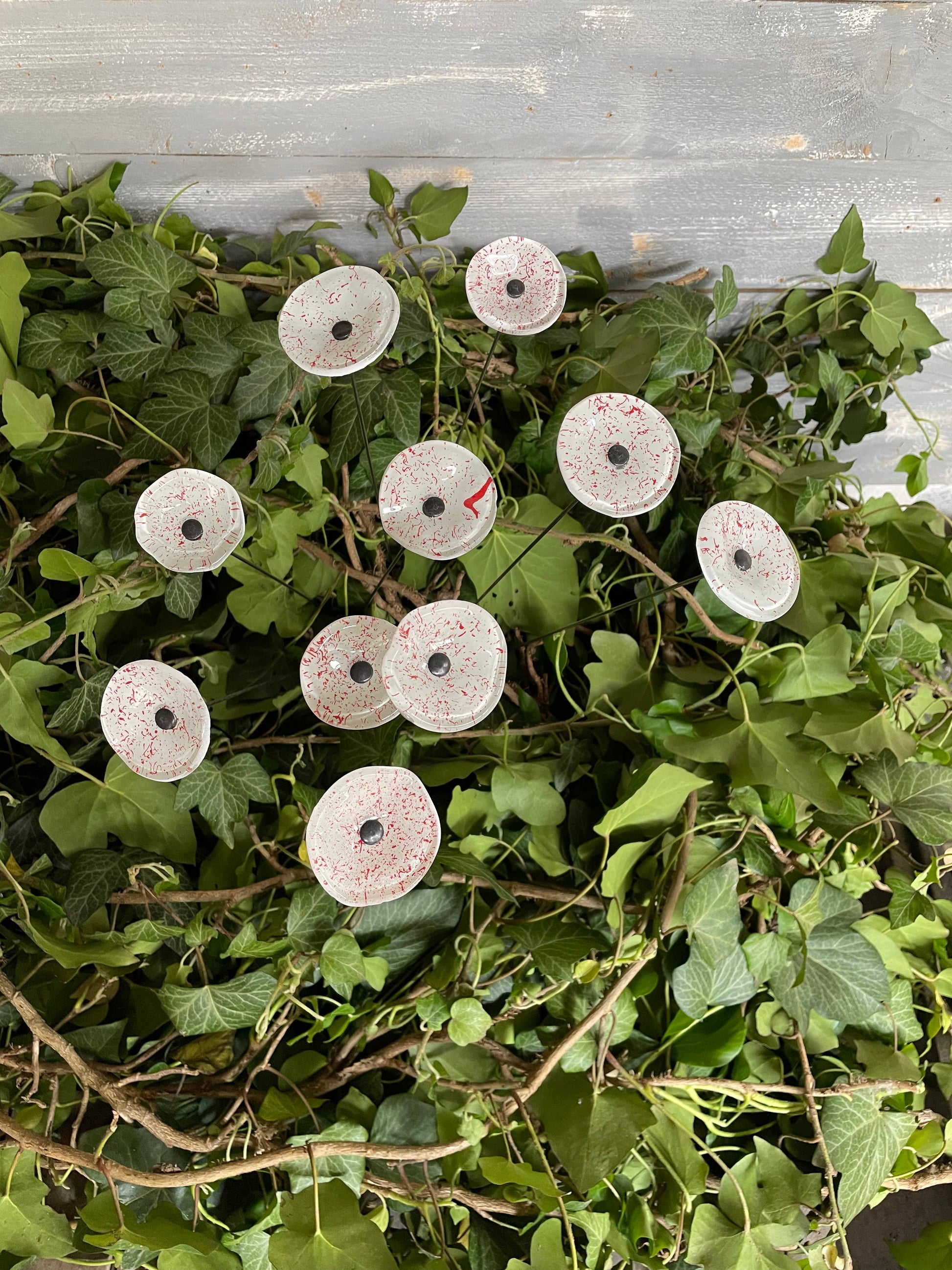 Round small glass flower in white, red colour combination. The vibrant and sparkling coloured flower brings light and design to your home. Diameter of the glass flower: 4,5 cm