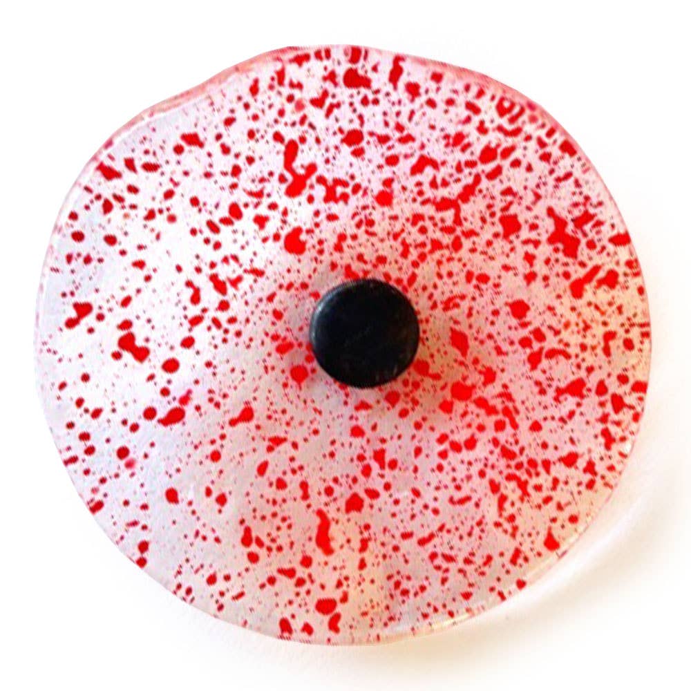 Round small glass flower for outside in transparent-red combination. The vibrant and sparkling coloured flower lights up and enriches your garden all year around. Diameter of the glass flower: 4,5 cm.