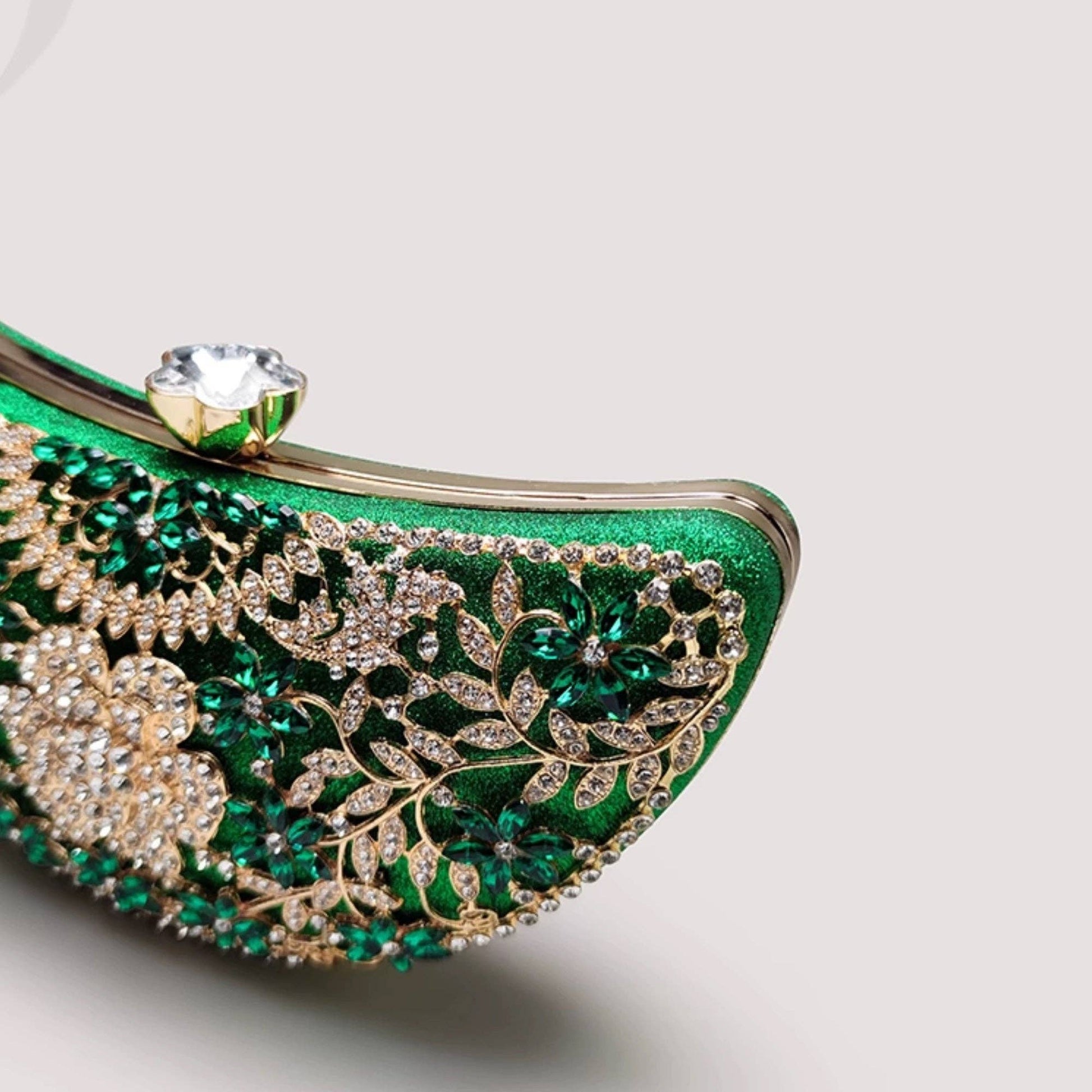 Add a touch of elegance and glamour to your look with our Dazzling Emerald Green Half Moon Clutch with Gold Flower Frame.