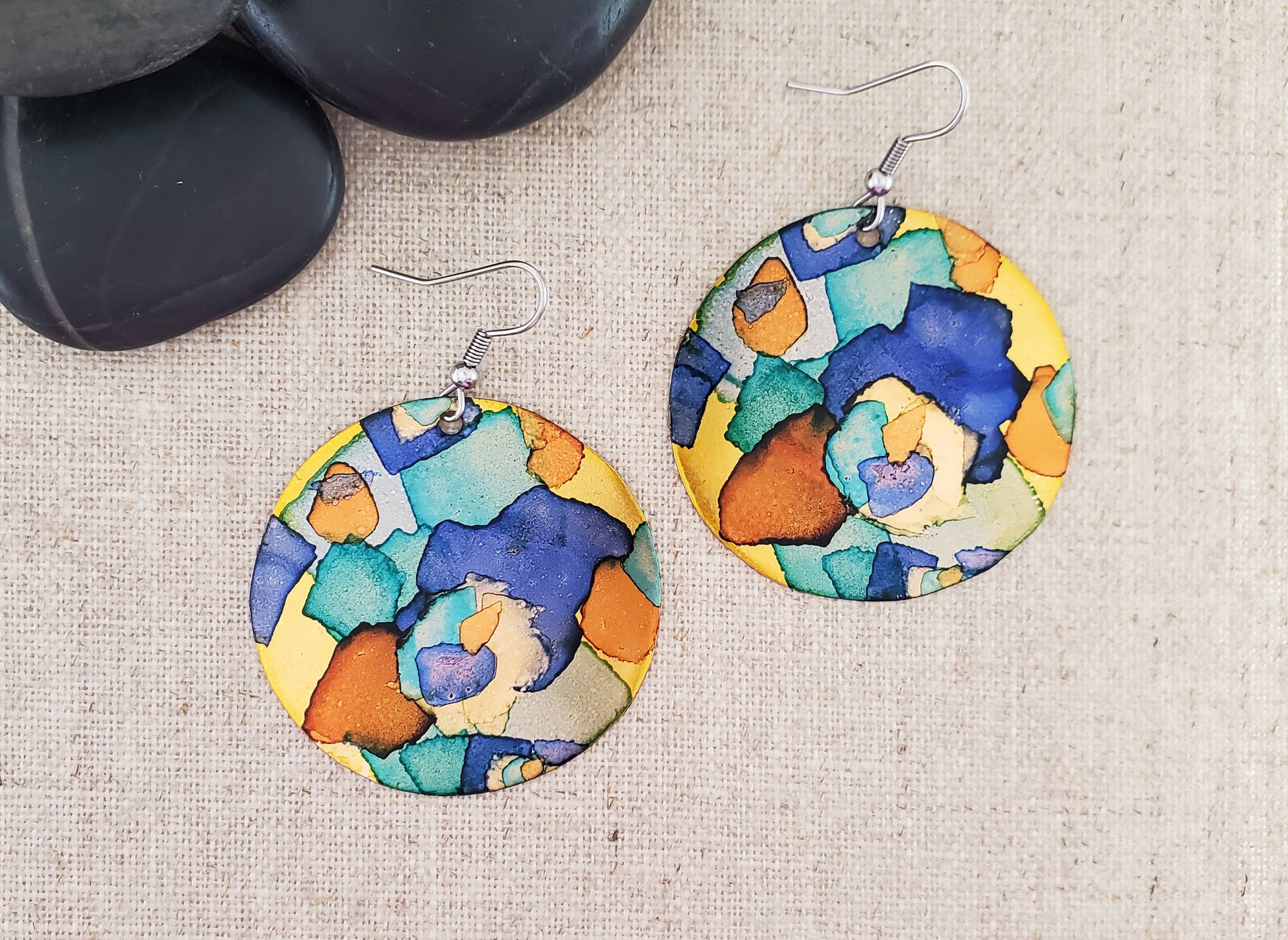 -The earrings are hand cut and finished copper blanks that are then hand painted with alcohol ink.