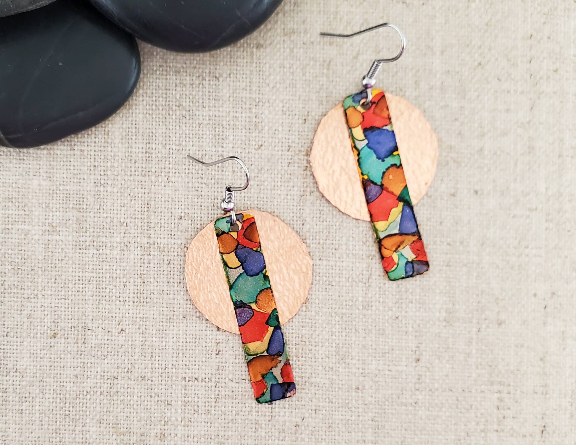 -The earrings are hand cut and finished copper blanks- the top piece is hand painted with alcohol ink and the back piece is hammered for texture