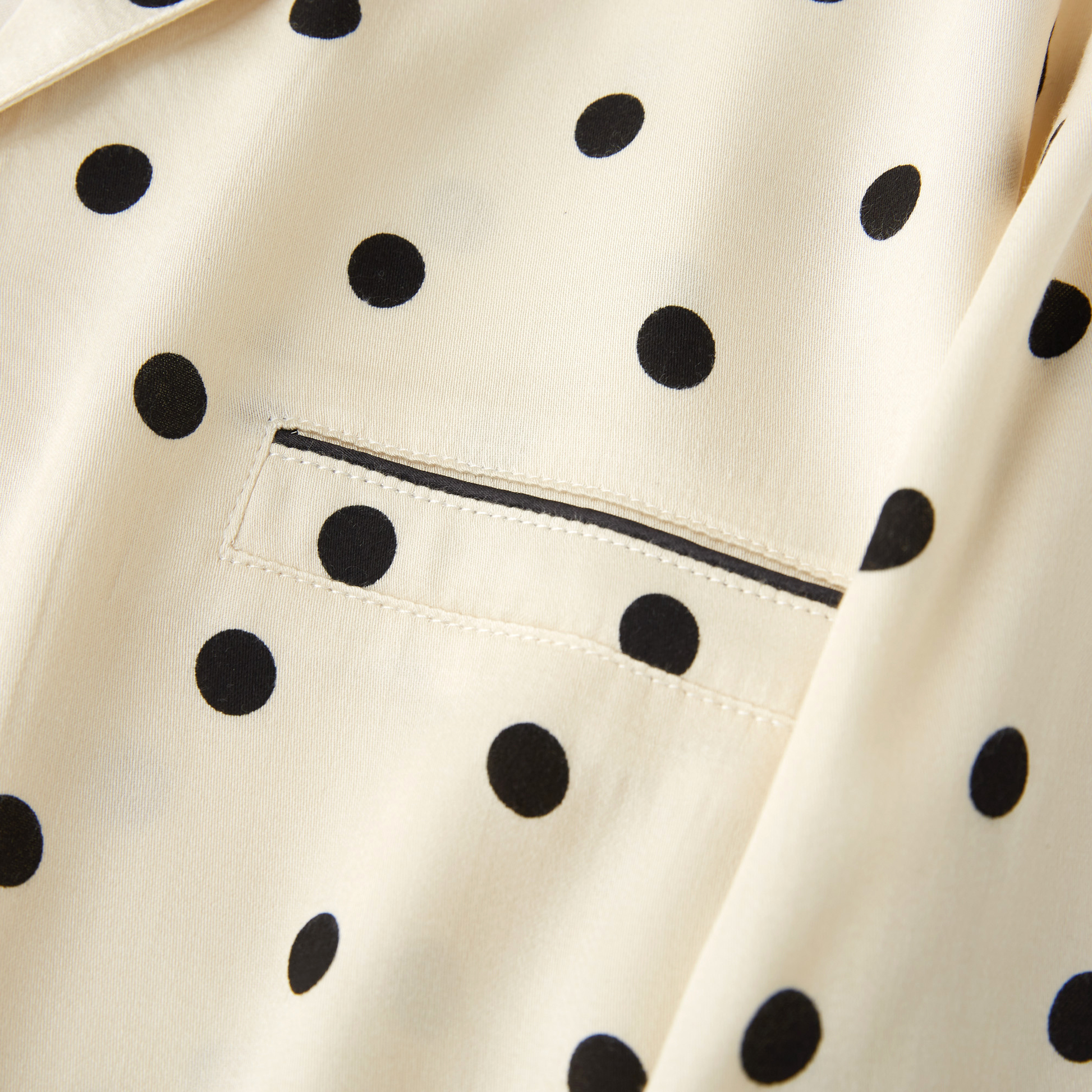 Elegantly adorned with playful polka dots, our pajama set promises a lightweight feel and a luxurious touch, making it an ideal relaxation gift for the discerning woman. Comprising a delicately tailored button-up shirt and matching drawstring trousers, each piece exhibits attention to detail with contrasting piping, ensuring you look effortlessly stylish, even in your moments of leisure.