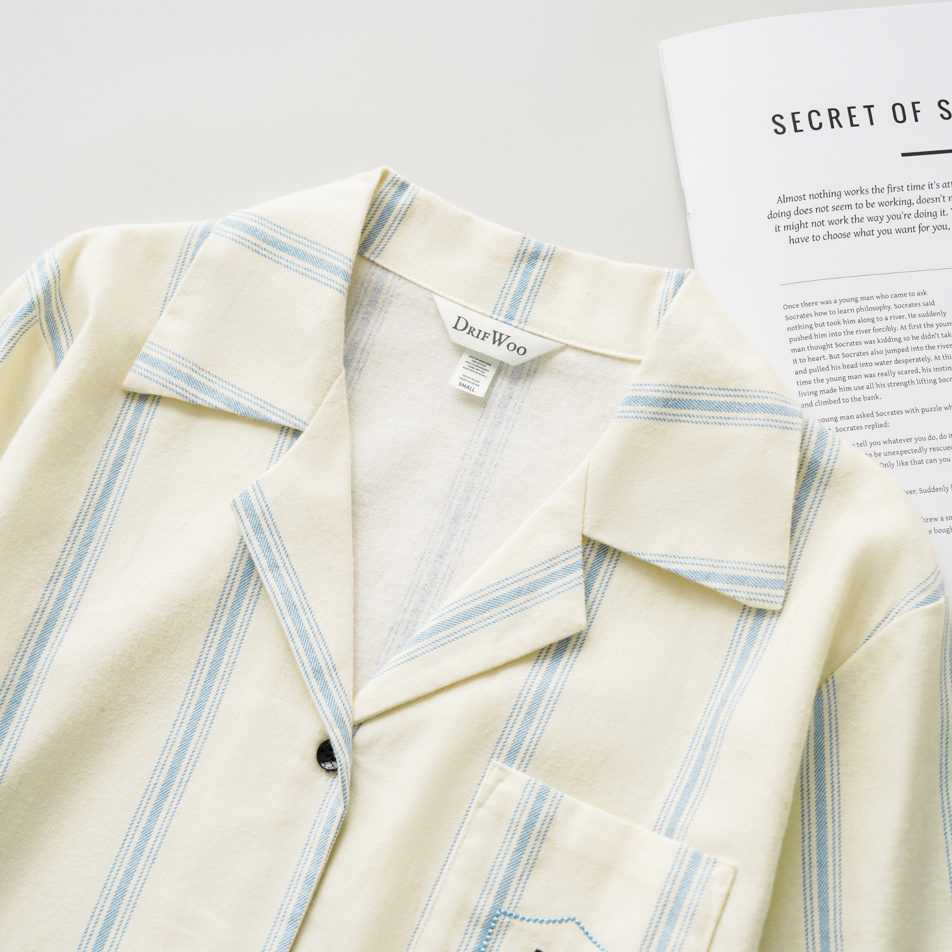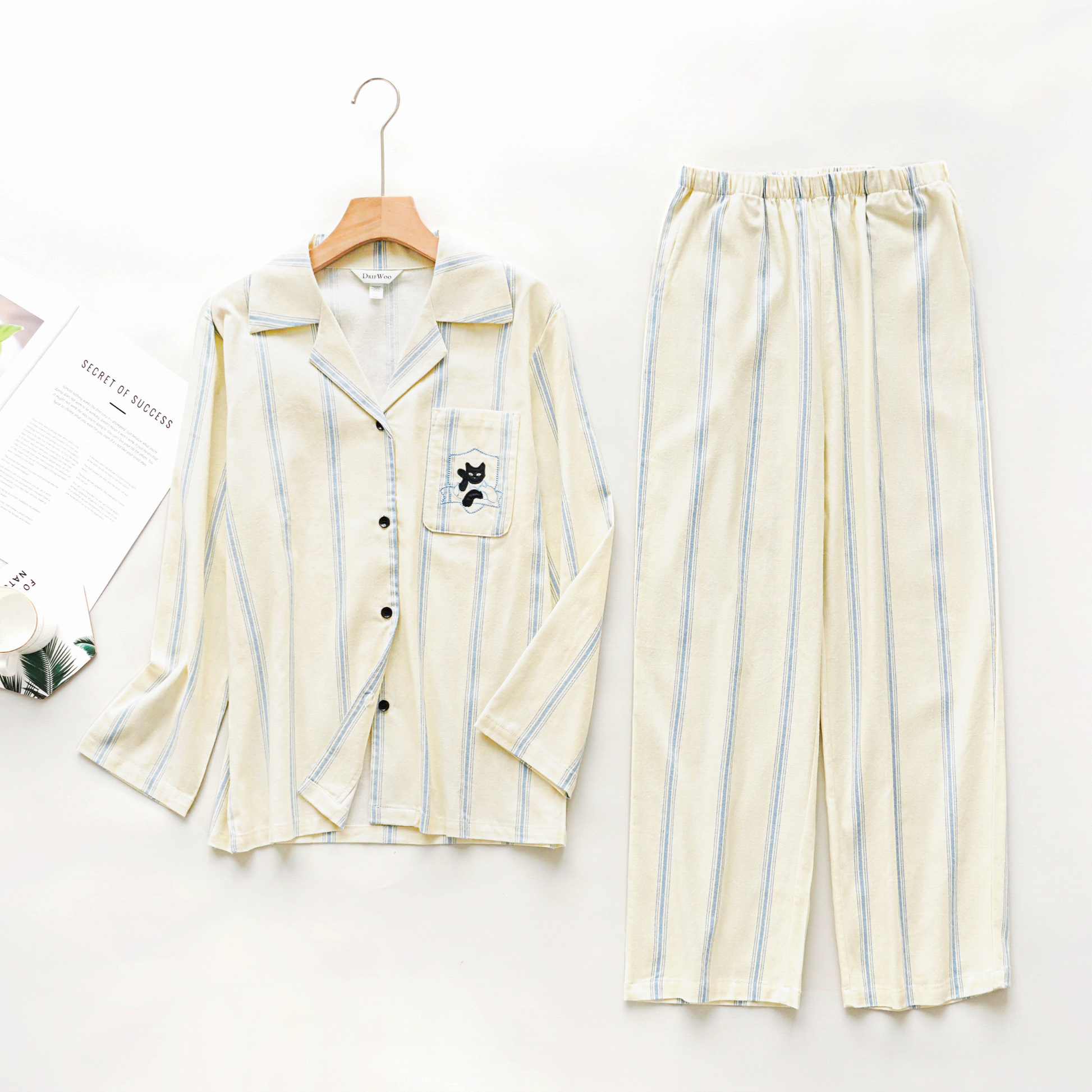 Relax in comfort with our striped loungewear set, crafted from 100% cotton to keep you warm and cozy. The blue stripe pattern on a soft cream background offers a classic, relaxed look. The fabric is skin-friendly with a double-sided brushed finish for a soft touch. Playful embroidered cat details add a fun twist to the design.