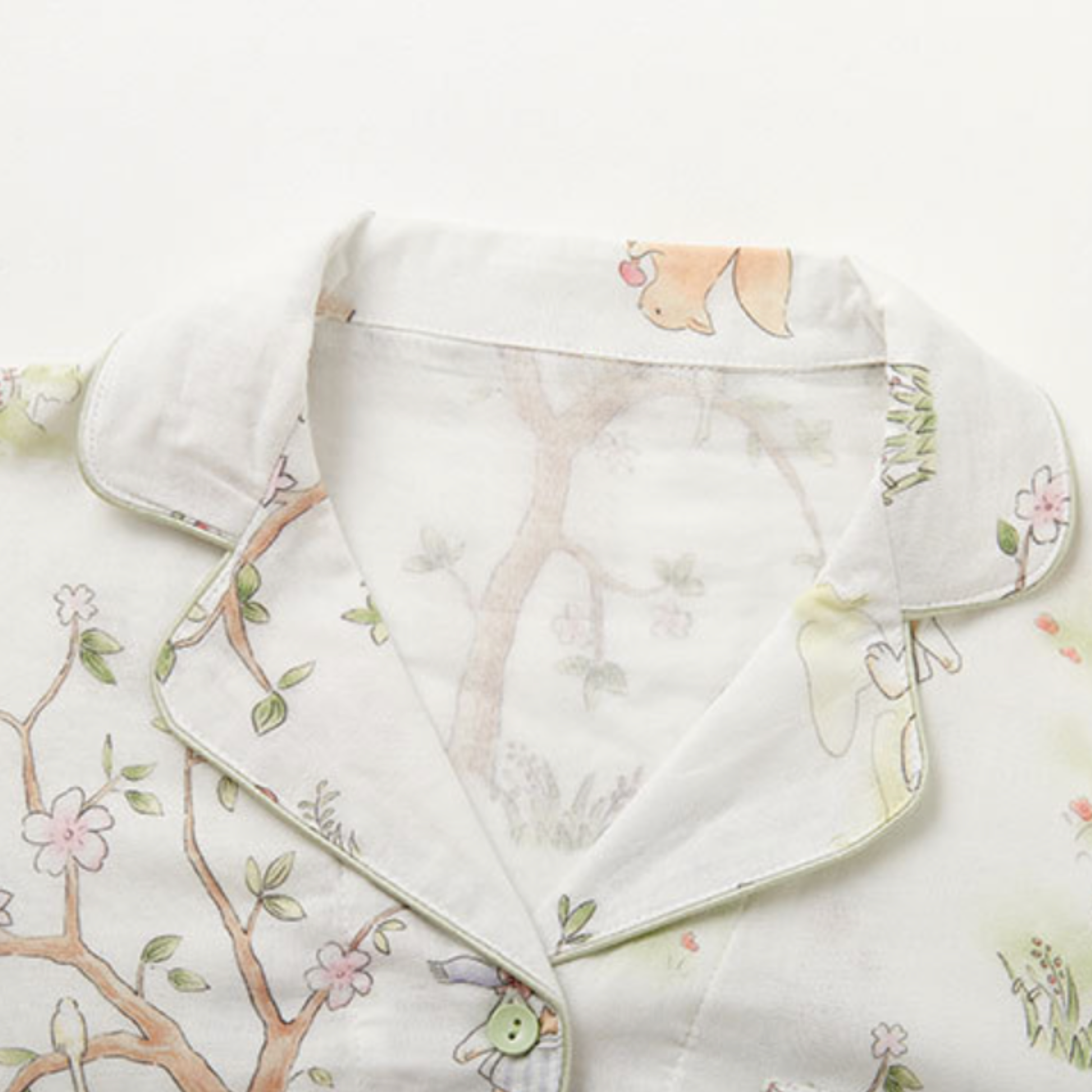 This soft and breathable pajama set is a must-have for spring! Featuring a charming woodland-inspired print, a relaxed-fit button-down top, and elastic-waist pants, it offers effortless style and all-day comfort. The double-layer bamboo-cotton fabric is ultra-soft, moisture-wicking, and perfect for year-round wear.