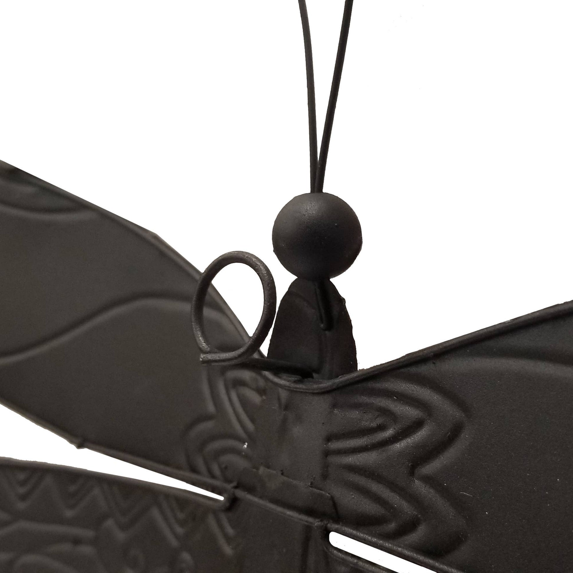 This dragonfly pays homage to the Indian peacock and its iridescent blue and green metallic plumage. Each wing has the distinctive eyespot for which this peacock is known. Bold and impossible to miss, the dramatic peacock design on this dragonfly glistens. The vibrant golds, blues and greens contrast in style. This dragonfly will add a strong punch of color to any room.The basic frame of the dragonfly is created using tin, which is powder-coated with a black finish and makes this piece safe to use outdoors. The edges of the frame are reinforced using thicker tin wire. The front of this piece is adorned in areas with capiz shell, an oyster native to the Philippines, before being hand-painted and sealed with a water-based sealant. The primary purpose of this oyster to provide a source of food, however, the shell is a sustainable by-product that can be used for decoration. The capiz shell subtly replicates the reflective qualities of dragonflies in nature.