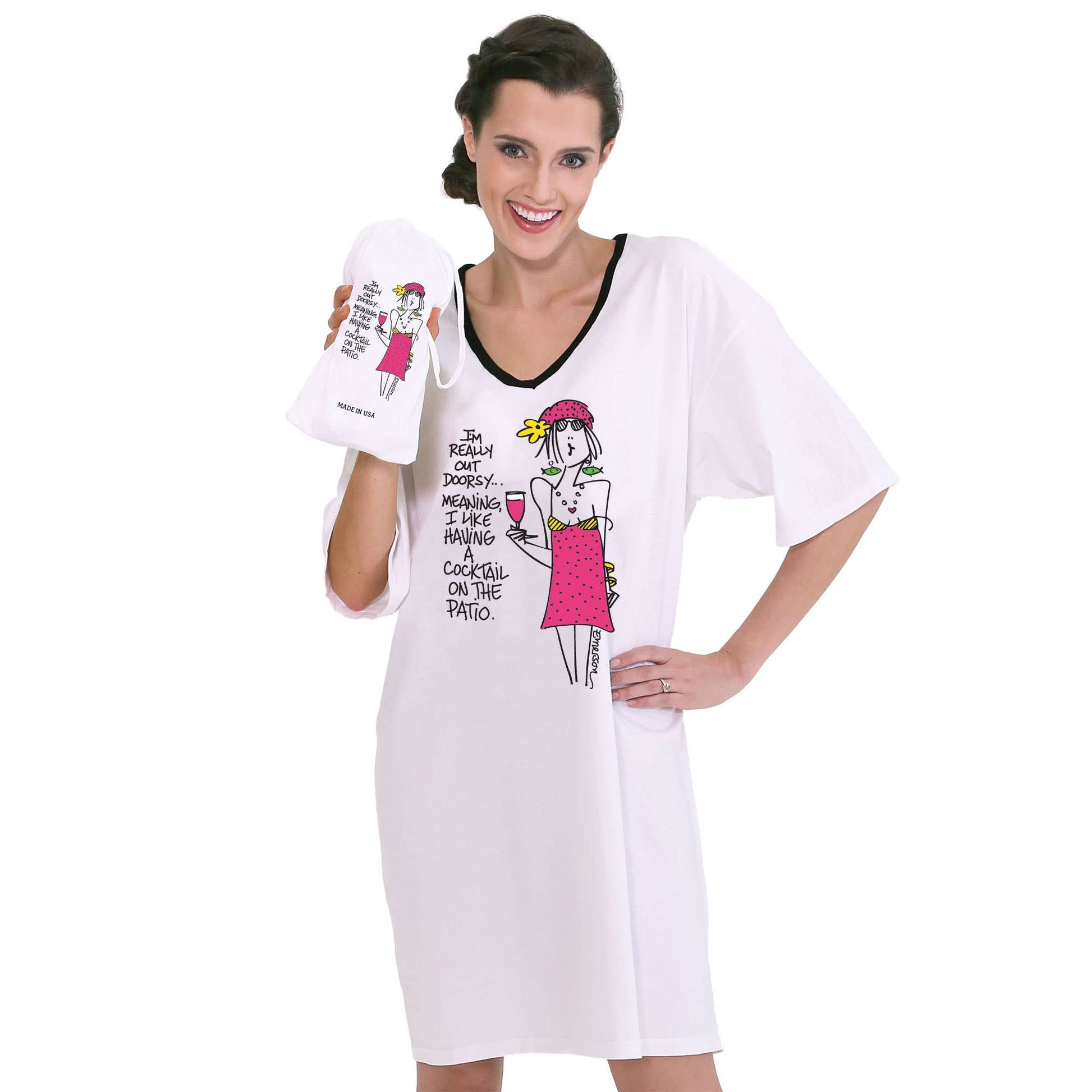 Made in the USA. 100% Cotton Nightshirt or Beach Cover Up, packaged in matching drawstring bag; featuring the whimsical art of Emerson Quillin. One Size Fits Most. The nightshirt measures 36 inches from high point shoulder and laying flat the chest measures 24", (48" circumference).