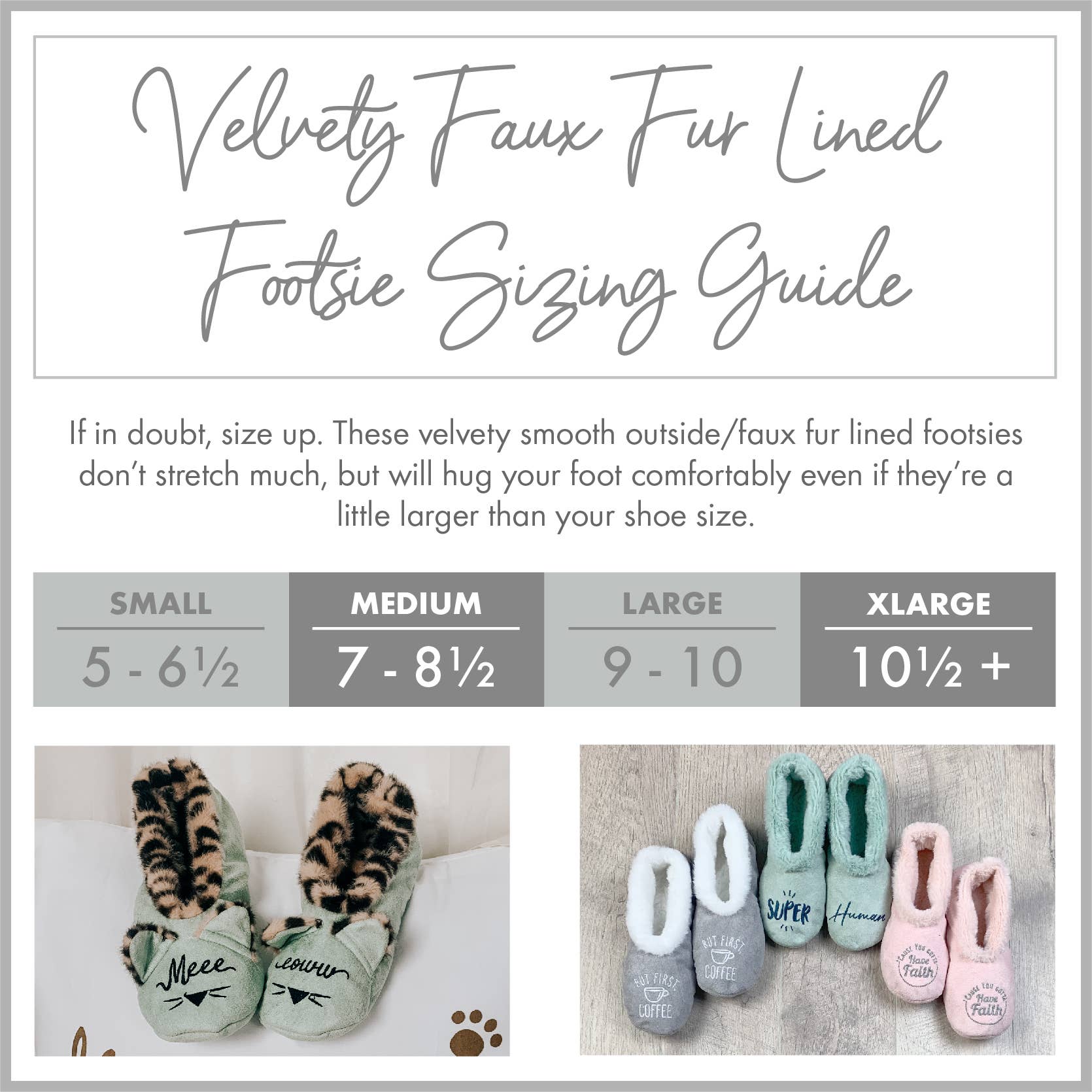 Our Meeeeoowww footsies are purrfectly adorable with furry wild animal print insoles and fur-trimmed ears sure to make your heart purr. The meeeowww message is perfect for your cat-crazy friend, or a va-va-va-voom reminder of the wild cat in all of us. Smooth finish outside with an elegant soft fur lining.