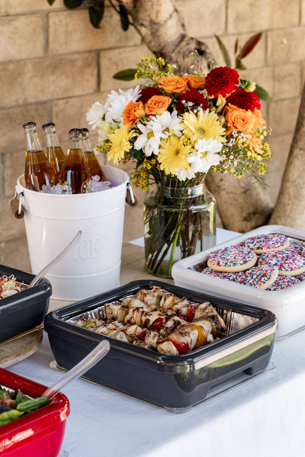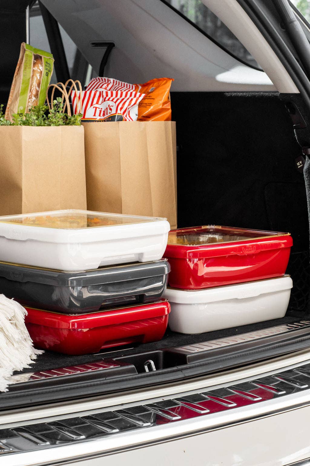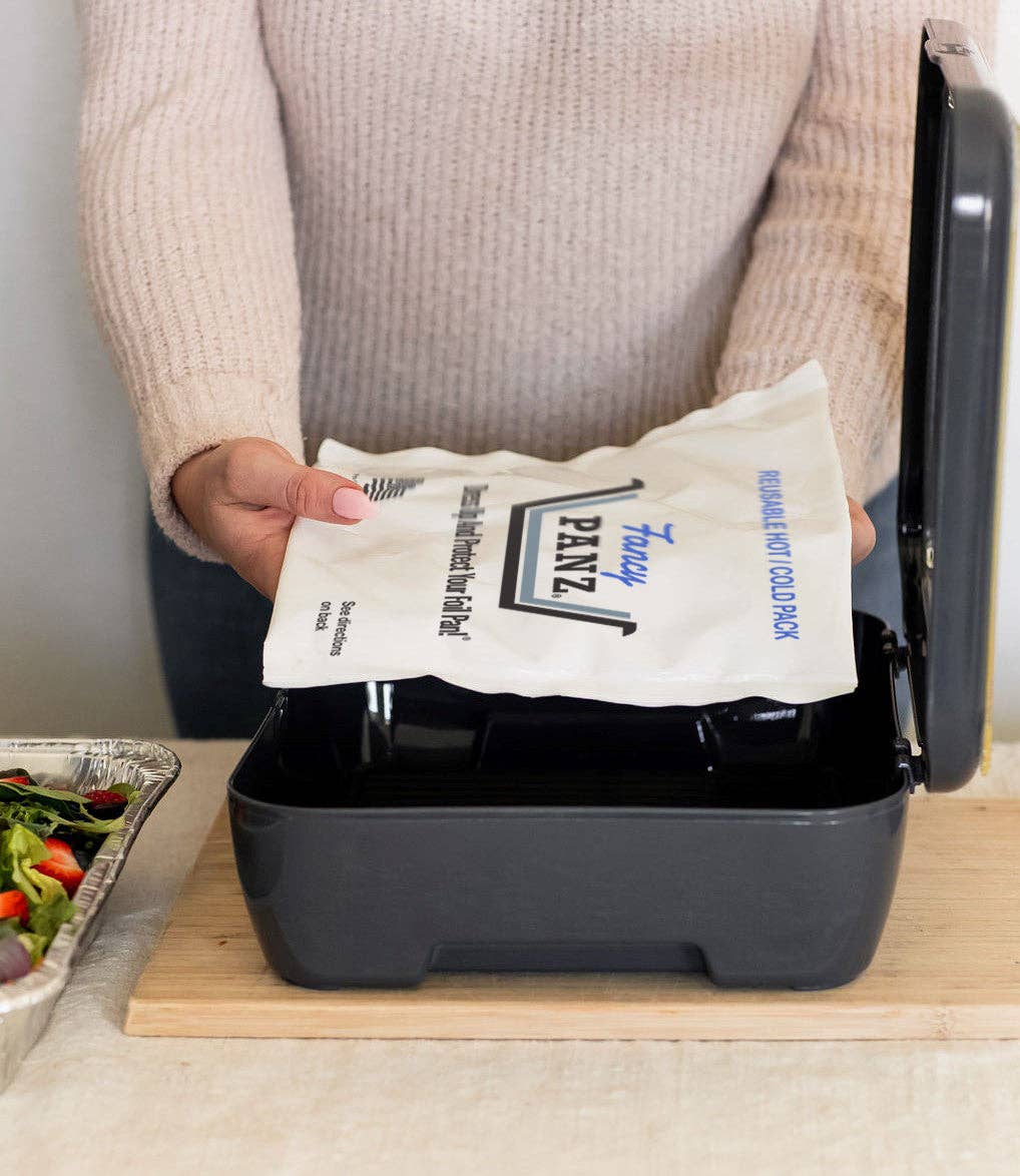 WHAT IS A FANCY PANZ PREMIUM: Fancy Panz are used to dress up, protect & serve from a foil pan. Our premium version comes complete with a reusable Hot/Cold gel pack that can be frozen, boiled or microwaved. It nestles between the base of your Fancy Panz & the bottom of your foil pan. INCLUDED: One reusable Hot/Gel Pack, one “half size” foil pan (approx. 12.75 x 9 x 2.5) & one reusable serving spoon EASY TO USE:- Open the attached frame, place your prepared Hot/Cold pack into the Fancy Panz, set your food filled foil pan directly on top of the gel pack & snap on the clear top. Use with hot or cold food, straight from the oven or fridge! TWO WAYS TO SERVE FROM FANCY PANZ: Remove the clear top & place under your Fancy Panz where it acts as a trivet OR leave the clear top on and lift from the tab to help maintain food temperature & keep pesky critters out! IDEAL FOR TRAVELING: Fancy Panz are stackable & sturdy! No more concerns over spilling the food during transport