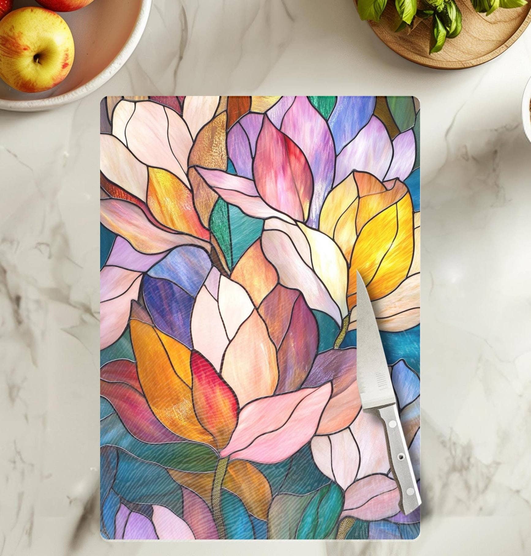 Elevate your culinary experience with our Imitation Stained Glass Flowers Tempered Glass Cutting Board. Exquisitely crafted, this versatile piece can be used as a charcuterie board, serving tray, or challah board. It is a stunning addition to your kitchen decor and combines functionality with elegance in two perfect sizes. It catches the light when displayed, making it ideal as kitchen decor or home display art. Discover refined kitchen art today.