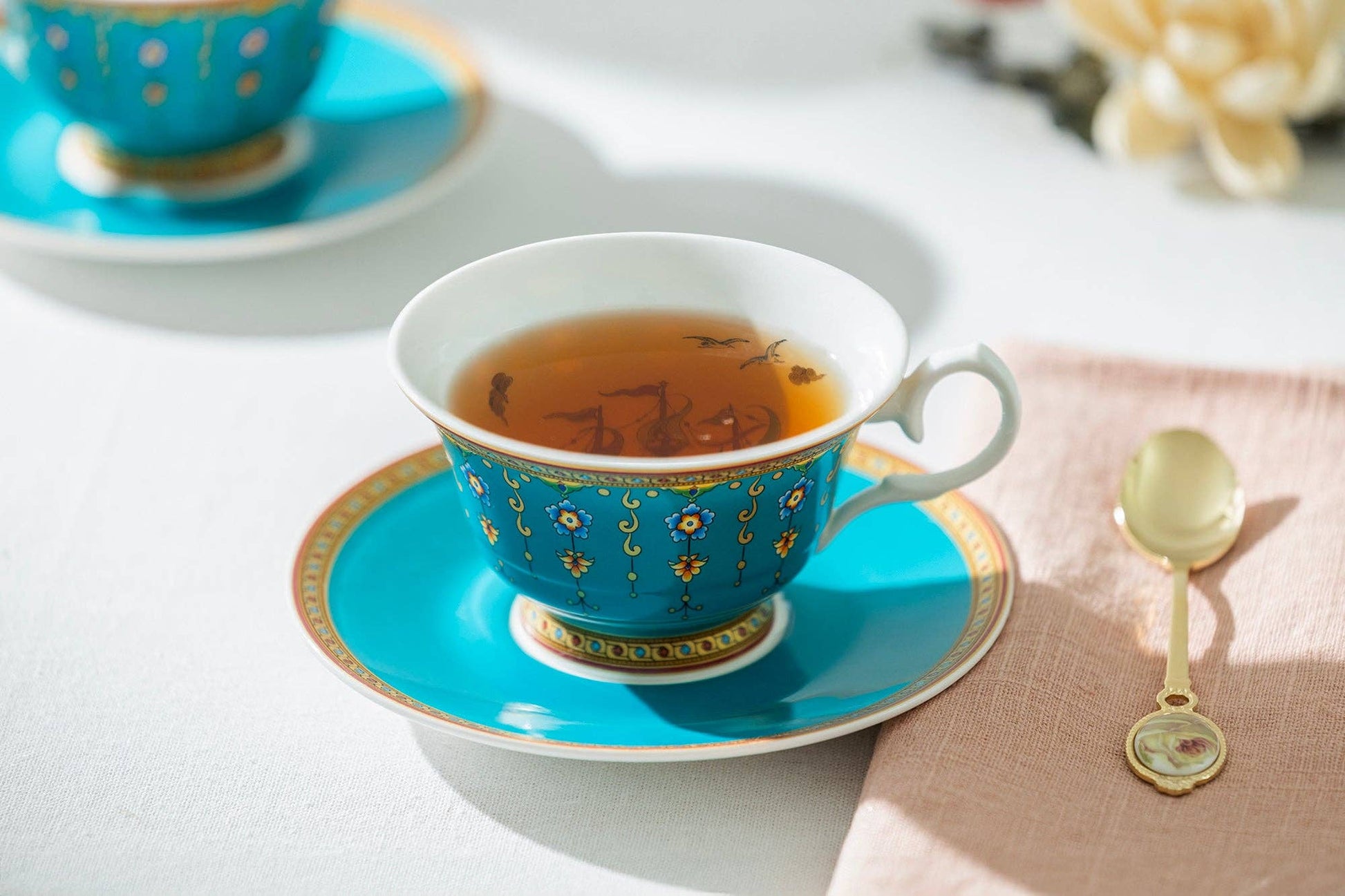 Each set includes - 1 cup with 1 saucer. The gold accents on the tea cup and saucer set are crafted using gold paint, ensuring a stunning finish. Despite the elegant detailing, this set is fully microwave safe, allowing for both beauty and functionality in everyday use.