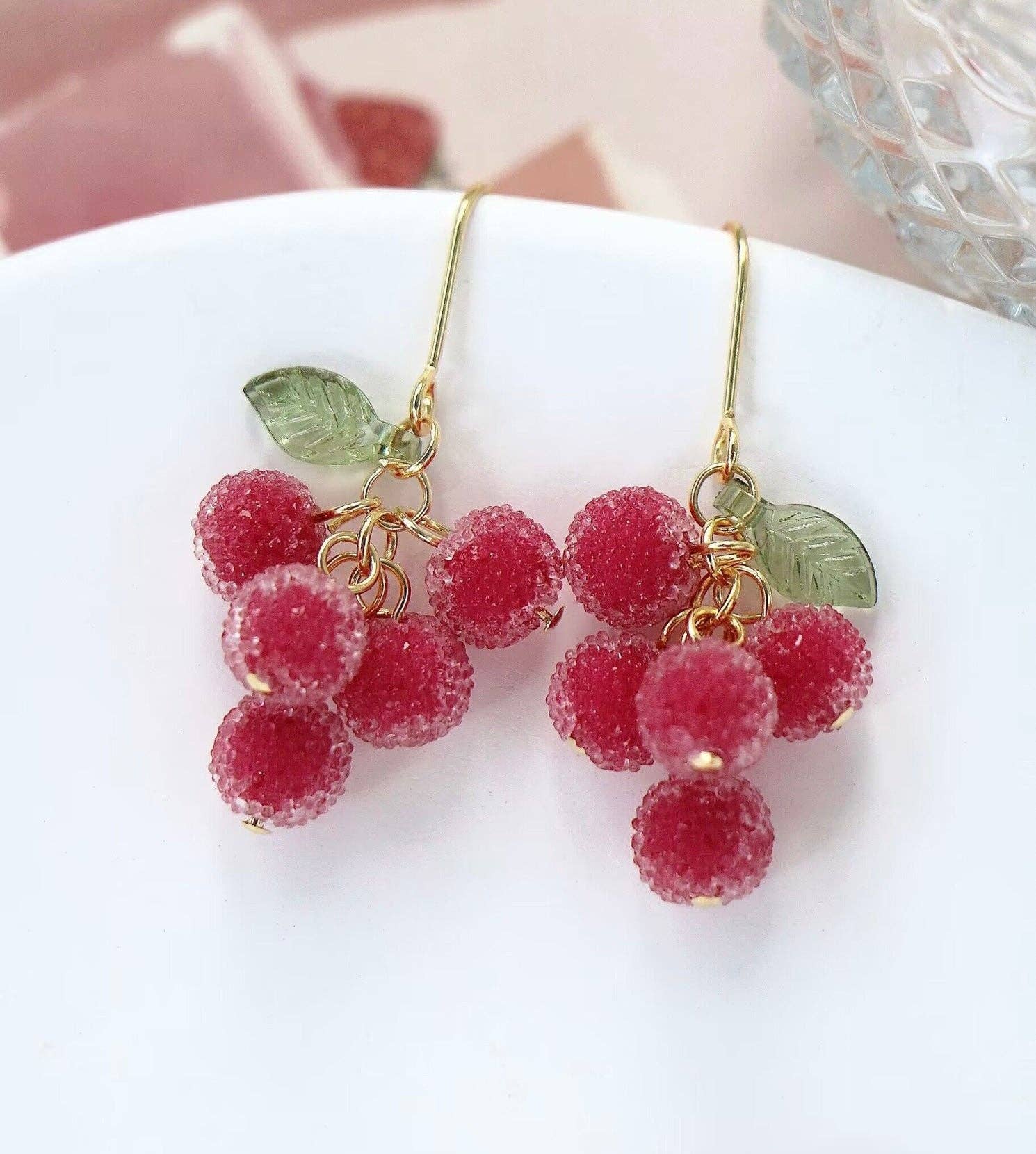 Haengseongworkshop - 18K Gold Plated 5mm Pink Chinese Bayberry Dangle Hook Earrings