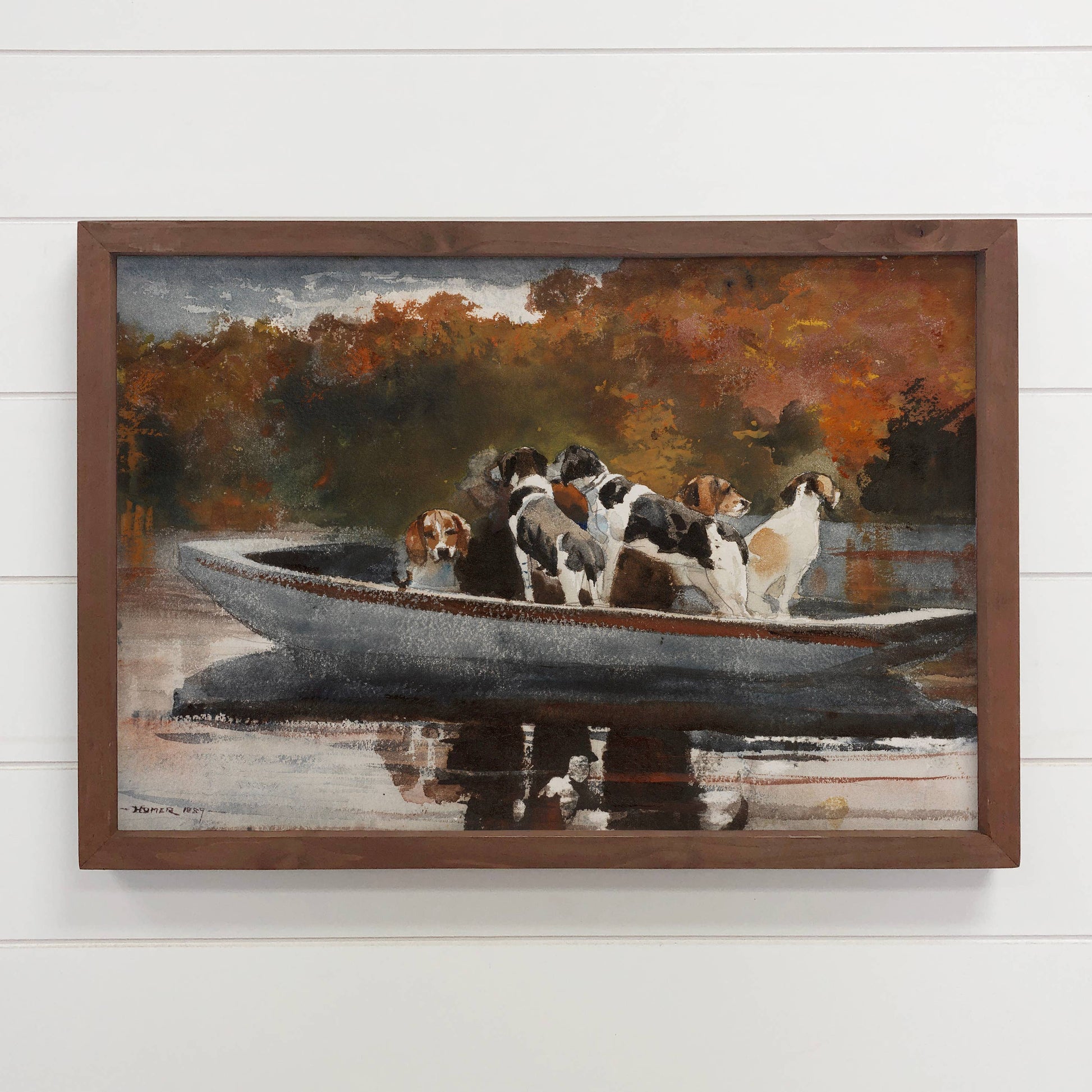 Hangout Home - Hunting Dogs on a Boat - Dog canvas Wall Art - Wood Framed: 24x36" Extra Large Canvas Art with Thick Wood Frame