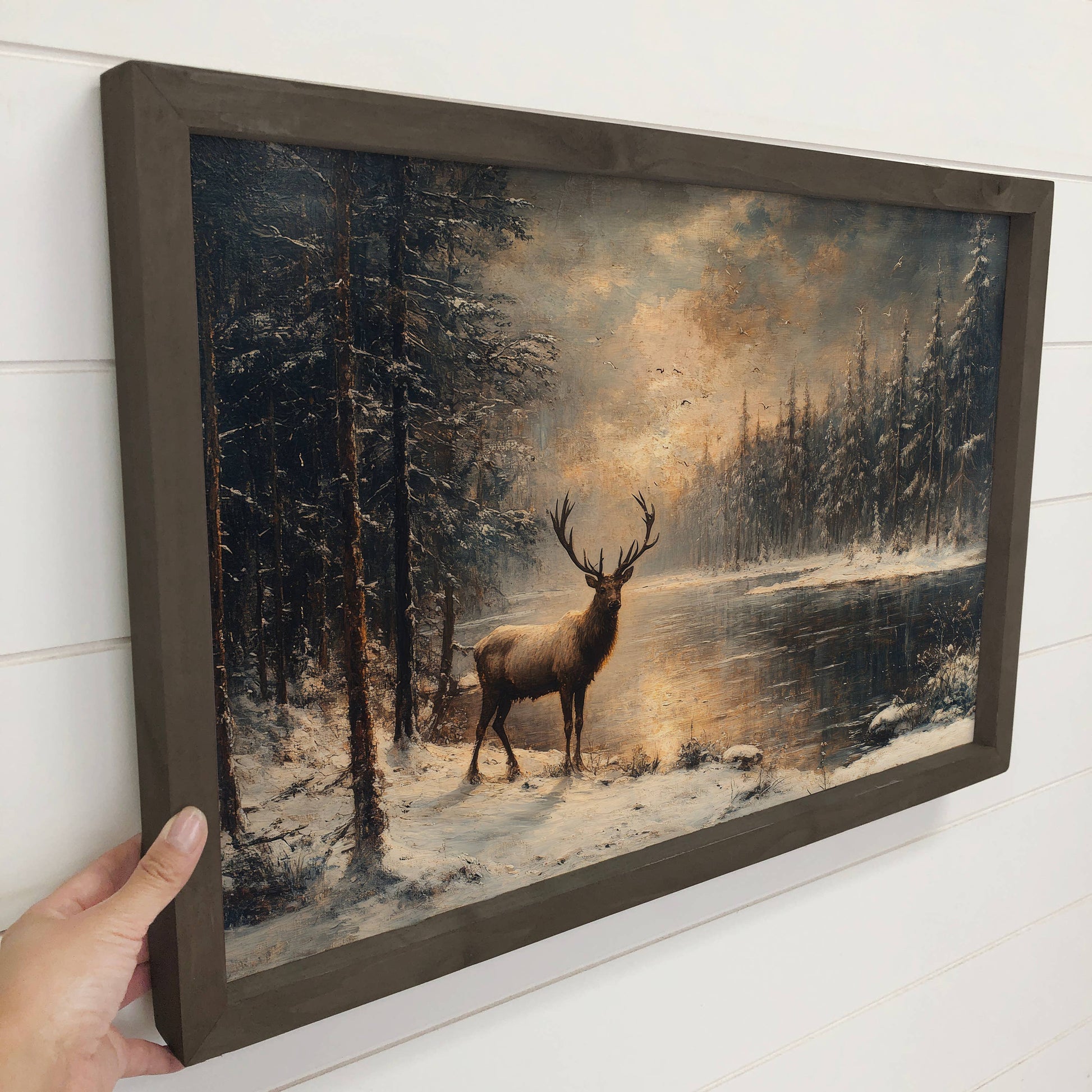 This serene art print captures the majestic beauty of a lone elk standing by the edge of a large river, surrounded by snow-covered riverbanks and tall pine trees dusted with winter's touch. The sunlight reflects off the choppy waters, casting golden rays through the clouds and illuminating the peaceful scene. Perfect for a study, this brings the quiet elegance of nature into your home.