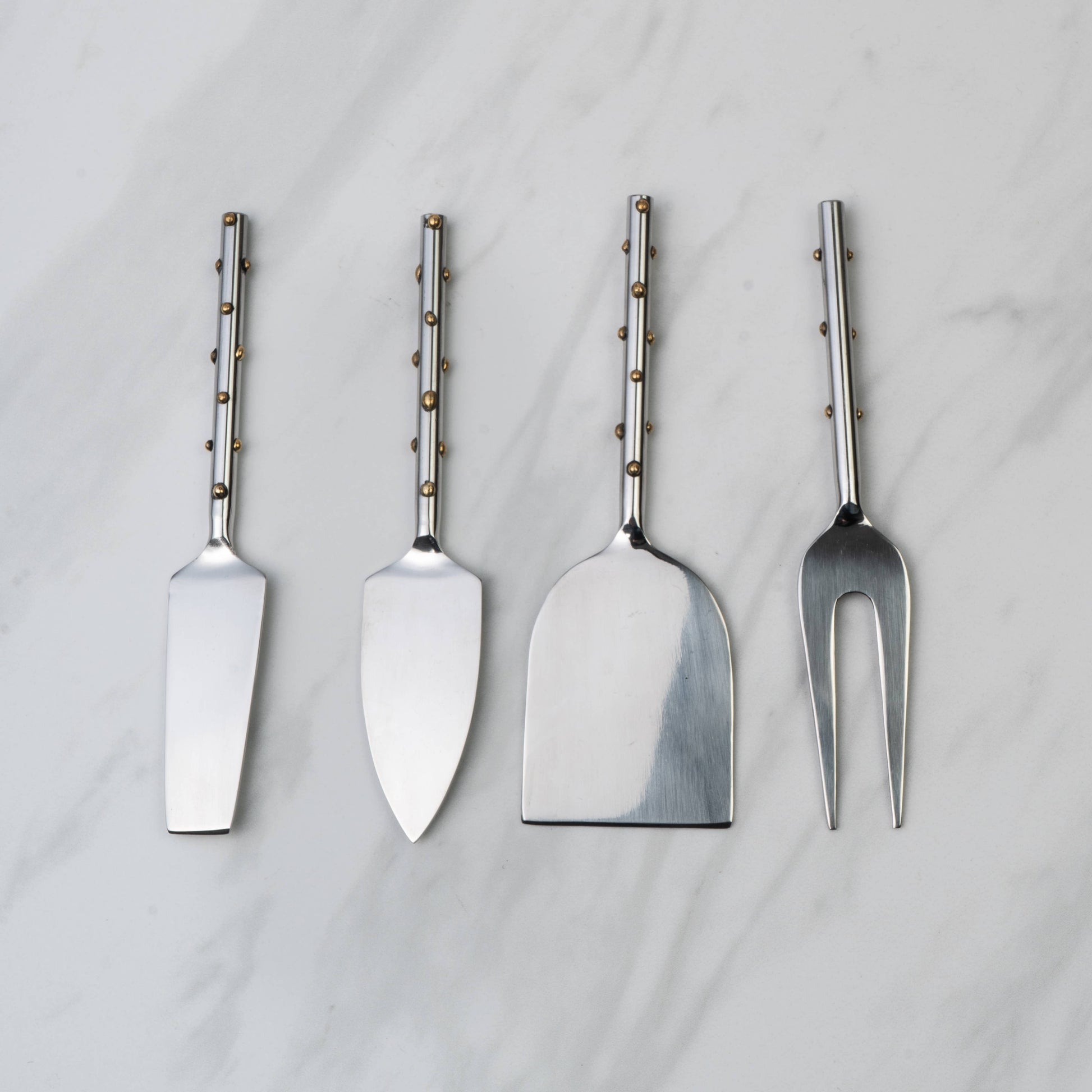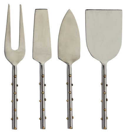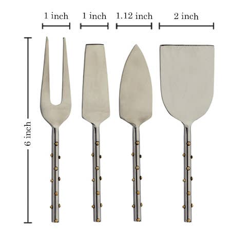 The SS Gold Dots Cheese Set is a stylish and functional addition to any home. This set includes four cheese tools, perfect for serving and enjoying your favorite cheeses. Made from high-quality stainless steel, these tools are durable and easy to clean. The gold dot design adds a touch of elegance to your cheese board or table setting. Whether you're hosting a dinner party or simply enjoying a quiet night in, this cheese set is a must-have for any cheese lover. Upgrade your serverware collection with the SS Gold Dots Cheese Set and impress your guests with your impeccable taste.