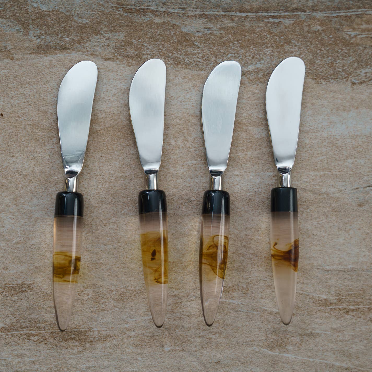 7" | The Steel Spreaders S/4 is a set of elegant and versatile serverware that will elevate your dining experience. Crafted from high-quality stainless steel, these spreaders are not only durable but also resistant to rust and corrosion. The sleek black marble handles add a touch of sophistication to any table setting, making them perfect for both casual gatherings and formal occasions. Whether you're spreading butter on warm bread or serving delicious dips and spreads, these spreaders are designed to provide maximum comfort and control. With their unique combination of stone and stainless steel, these spreaders are a must-have addition to your kitchen collection.