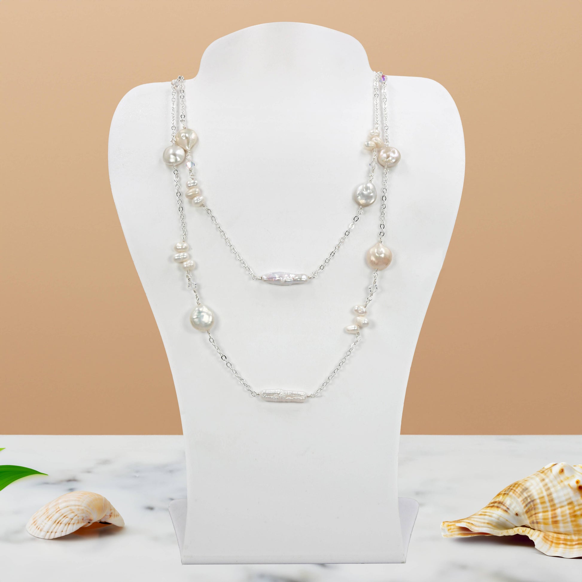 Experience a symphony of shimmer and light with our Iridescent Pearl & Crystal Cascade Necklace. This captivating 19-inch necklace, with a 2-inch extender for adjustable length, features a dynamic blend of luminous freshwater cultured pearls and brilliant crystals. It showcases pearls in various unique shapes, including coin, rice, and baroque shapes, each contributing to the necklace's organic charm and natural iridescence. These are beautifully complemented by faceted aurora borealis crystals, which catch the light with mesmerizing, ever-changing flashes of color. Each pearl and crystal is meticulously hand-wired and beaded with shimmering silver-tone chain and wire, creating a delicate and flowing design. Finished with a durable stainless steel lobster claw clasp and extender, this necklace is a radiant statement piece perfect for adding sophisticated sparkle and natural beauty to any ensemble.