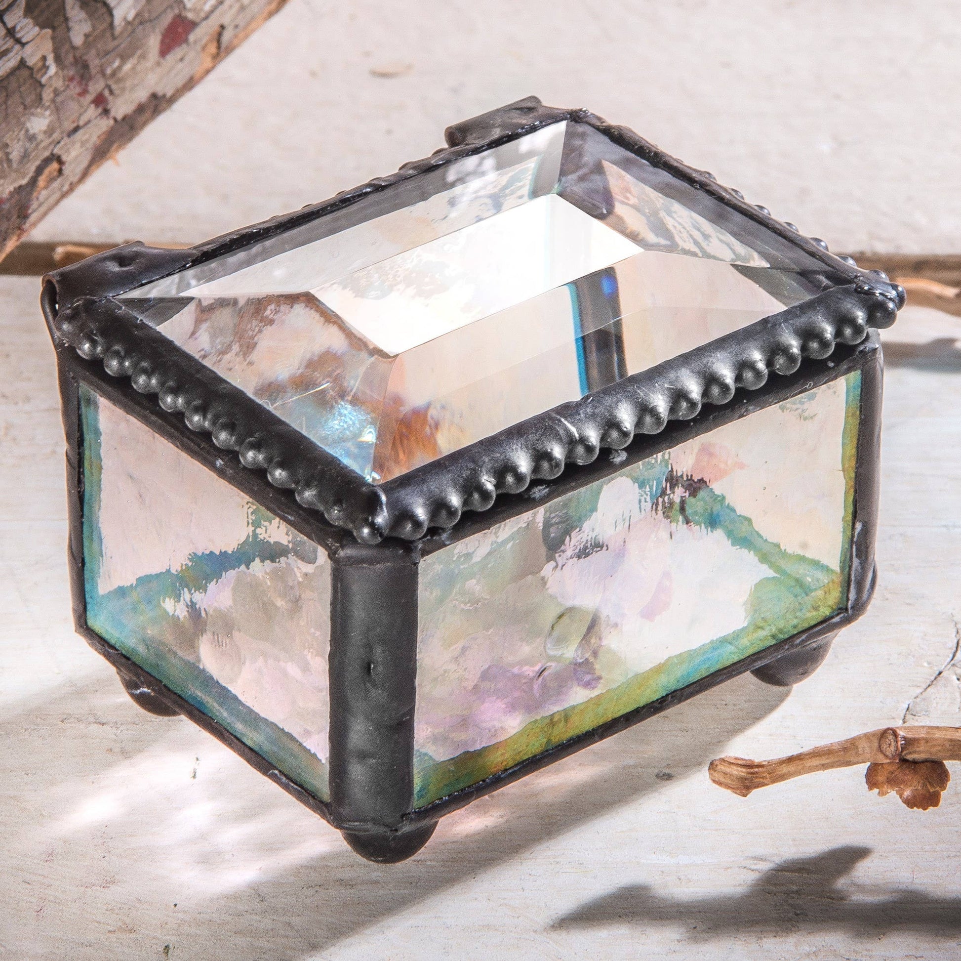 An iridescent glass bottom shimmers and shines in the light to cast brilliant shapes and colors across the tabletop. Perched on round ball feet and trimmed with a beaded edge this small glass box has it all. Perfectly sized for rings, earrings and small jewelry its ideal for girls of all ages. Mini in size and big in style use for an engagement ring presentation or a safe place for rings on the night stand or next to the kitchen sink. This handcrafted stained glass box has been made with lead free solder to protect you and the environment. The metal trim and solder have been stained with an antique charcoal patina and a wax.