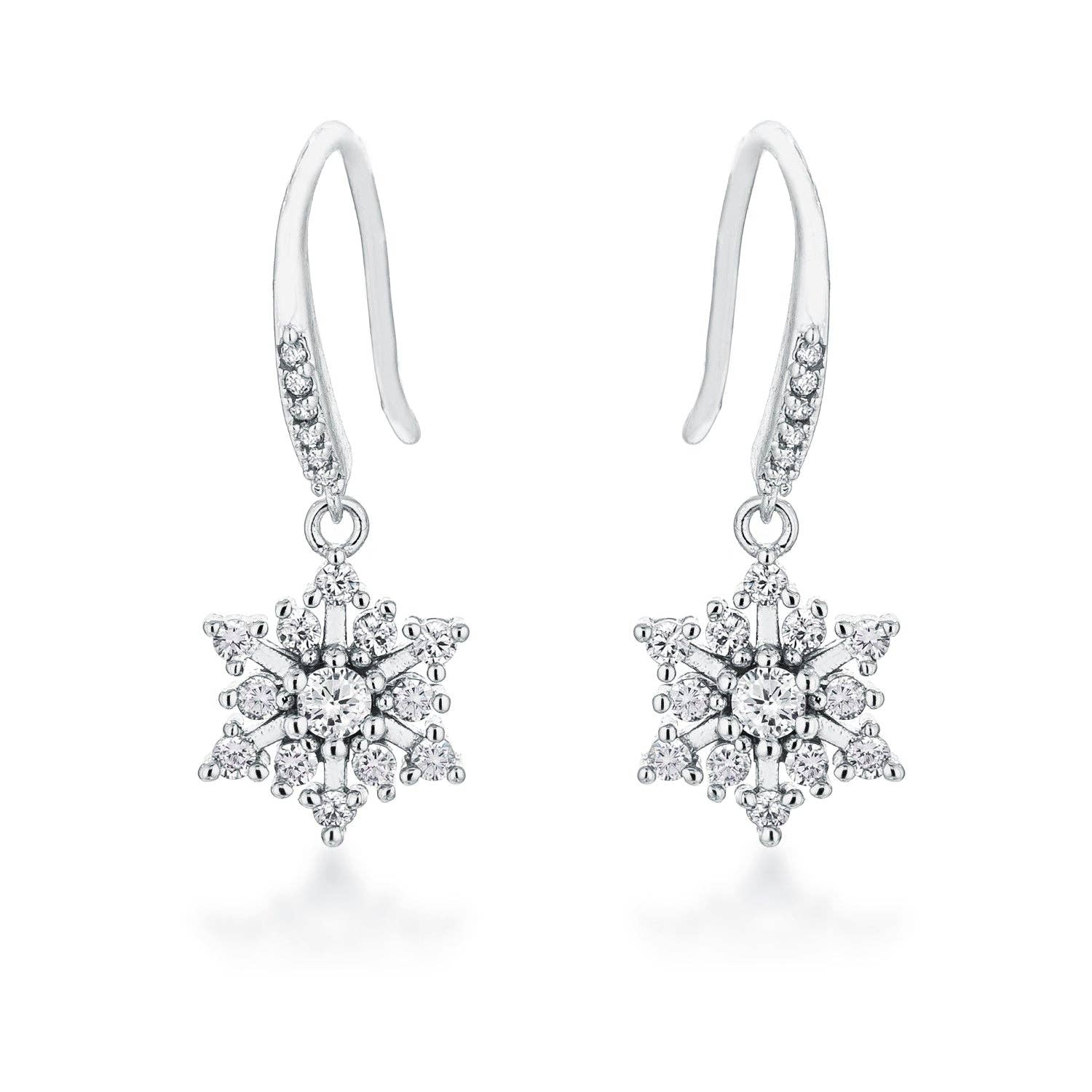 Embrace the winter wonder with this rhodium plated CZ snowflake earrings. Intricate details dangle elegantly, adding a touch of Christmas magic to any ensemble.