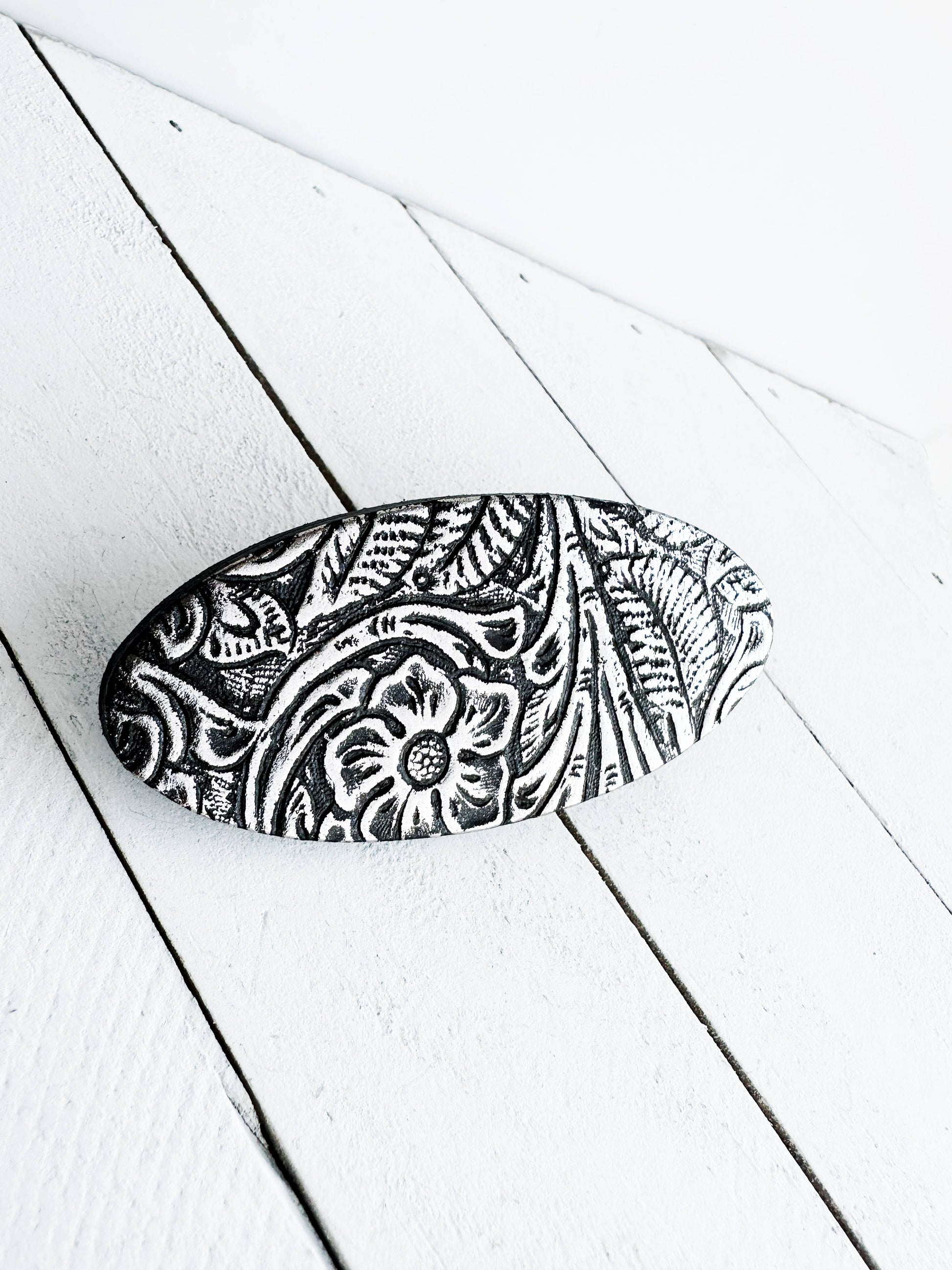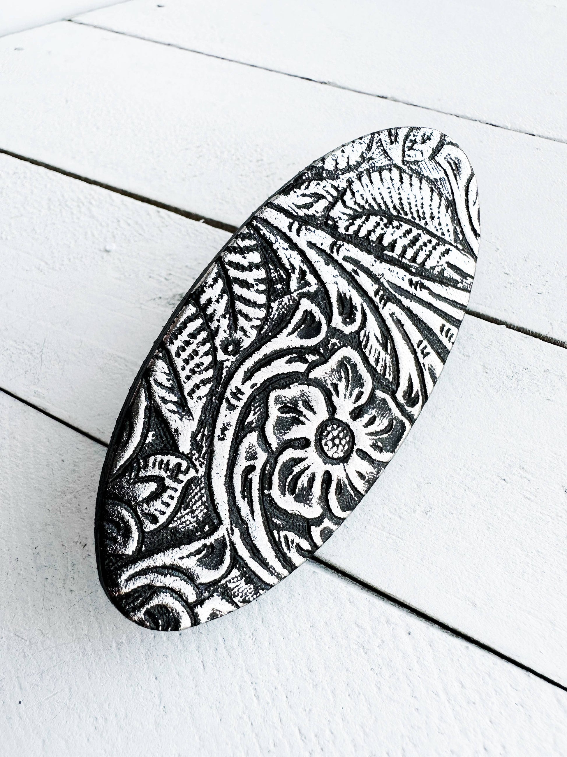 "Impressions" - Black leather imprinted with a raised floral & leaf pattern in brushed metallic silver.