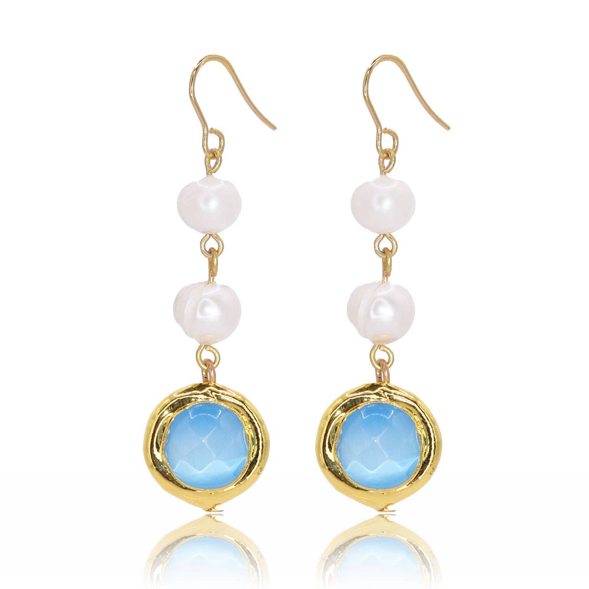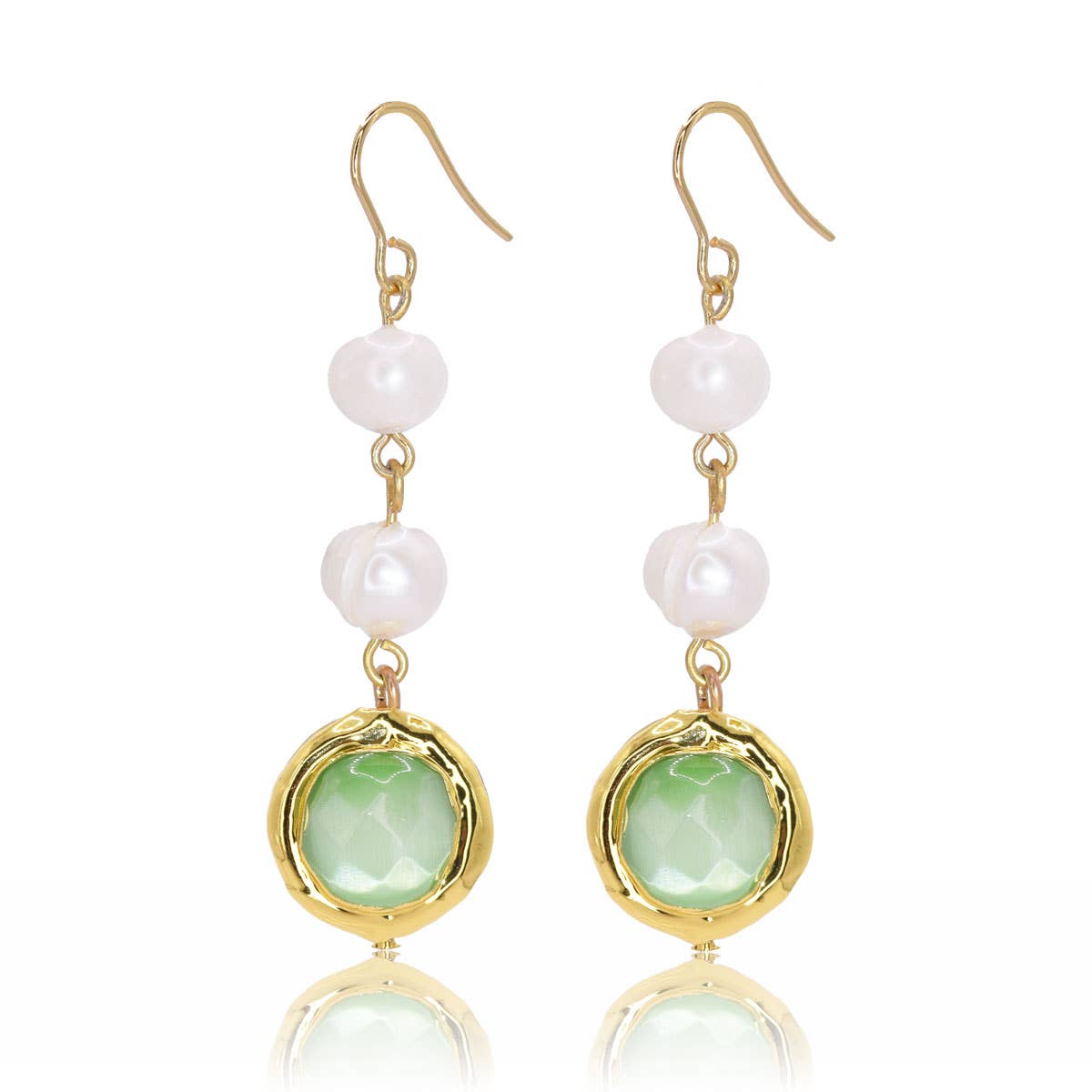Elegant linear drop earrings featuring 2 small creamy white fresh water pearls and a iridescent colored bead all dangling from a delicate French wire
