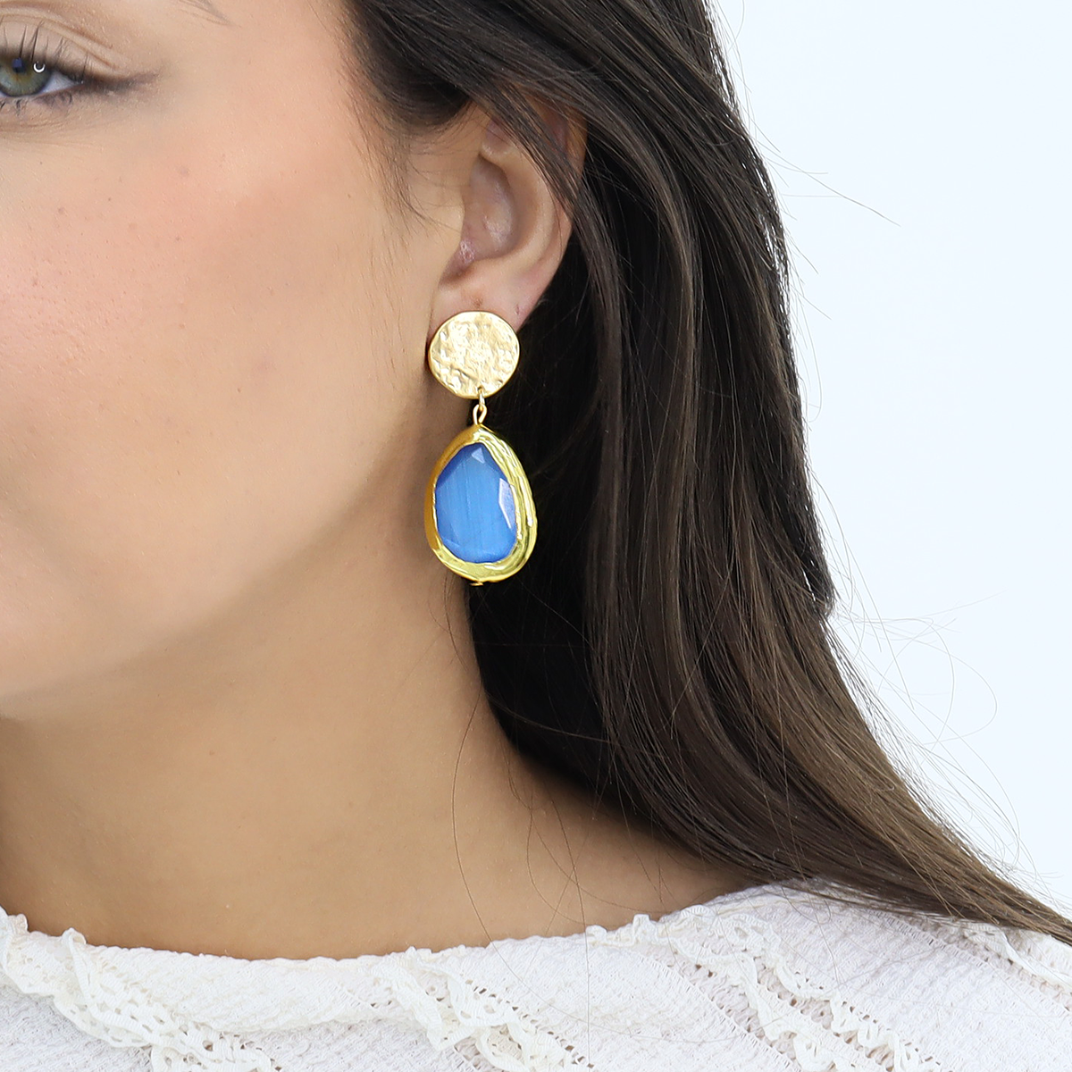 Elegant dangle earring featuring a large Vivid stone pendant and a gold clip-on coin