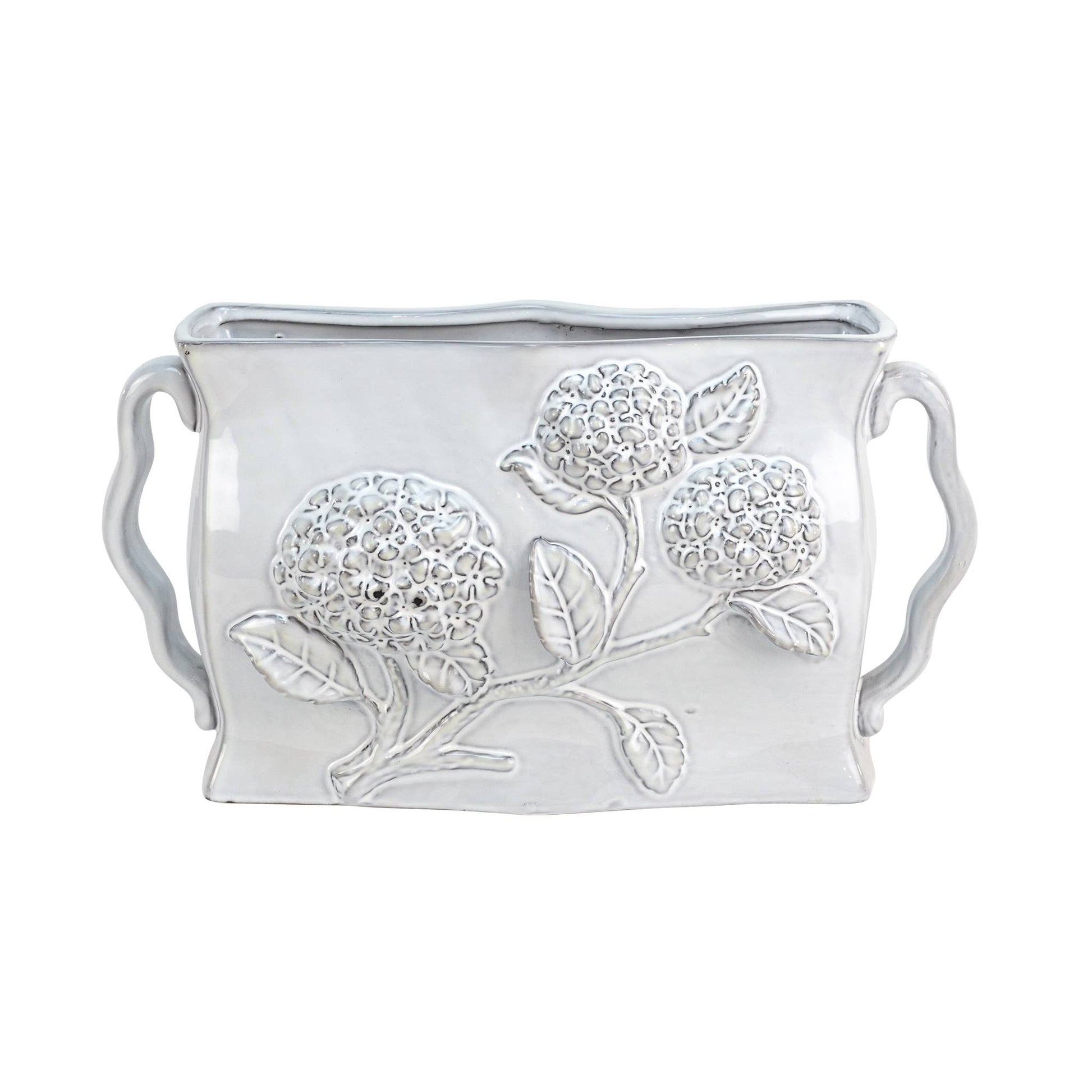 Brighten up your living space with our delightful Hydrangea Short Vase! This charming vase is an ideal decorative piece for any area in your home. It measures 17Lx6Wx9.5H, boasting a wide rectangle shape with gently undulating edges and a stylish ogray glazed coating. Adorned with intricate hydrangea blooms, this vase marries beauty with utility. Complete with handles on both sides, it effortlessly brings a touch of the outdoors inside. Enhance your interior design with the elegance of our Hydrangea Short Vase.