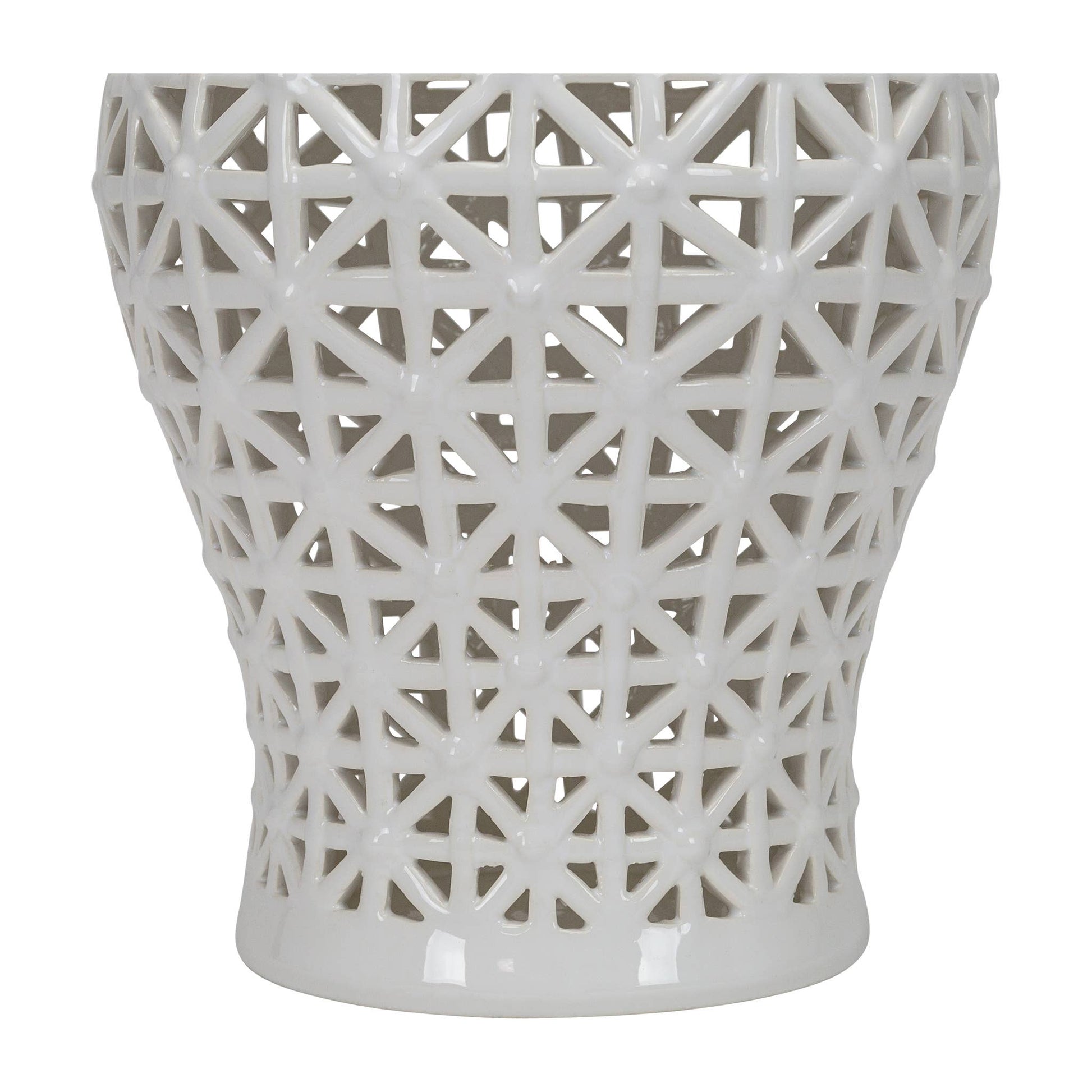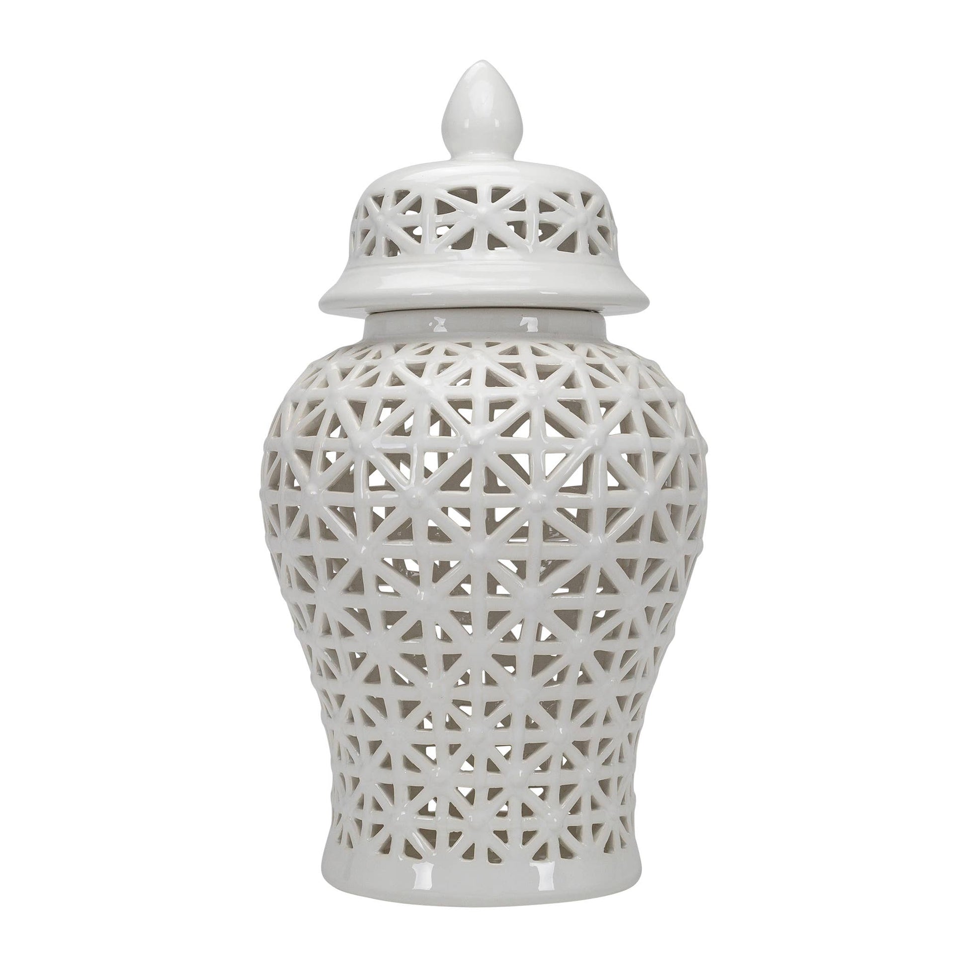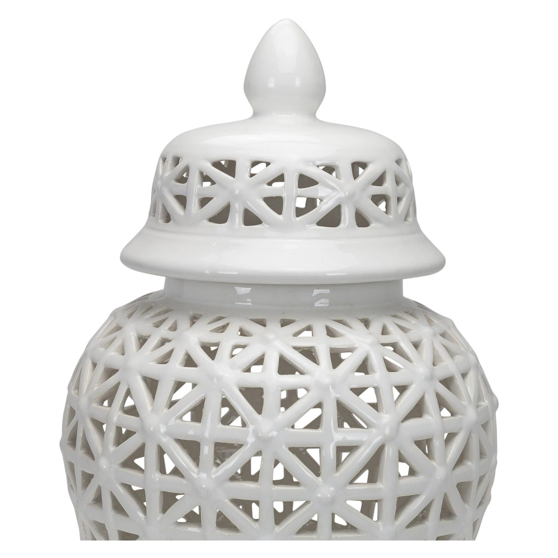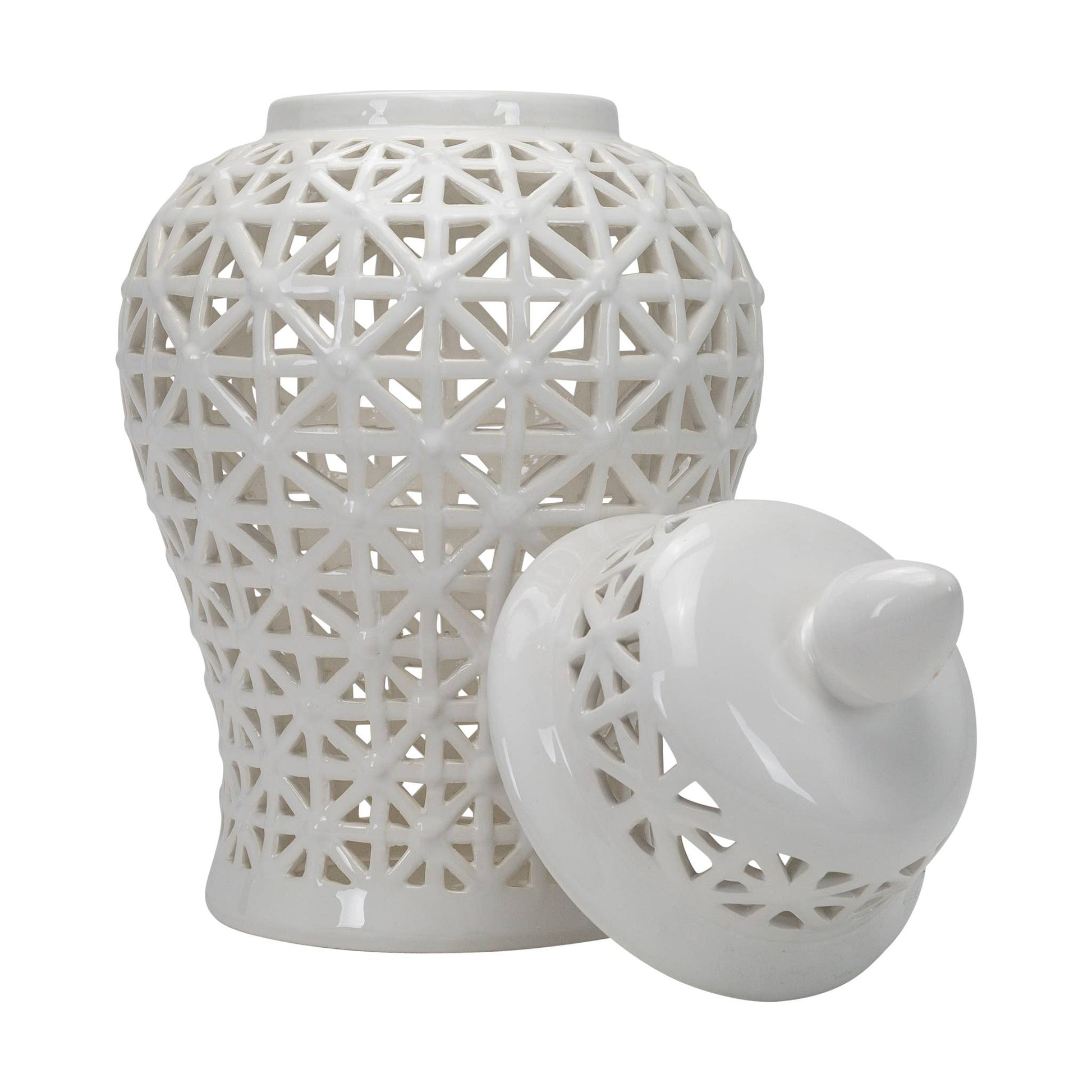 The Teague Jar is a beautiful, white ceramic jar with a lattice design. It's an ornate piece in a traditional jar design with a glossy finish, a removable lid and cut out pattern. The intricate details make it an interesting multi-purpose indoor decor. It can even serve as a faux flower vase that will enhance any home decor and brighten up any space. The Teague decorative jar measures 17 inches high and 9.5 inches in diameter.