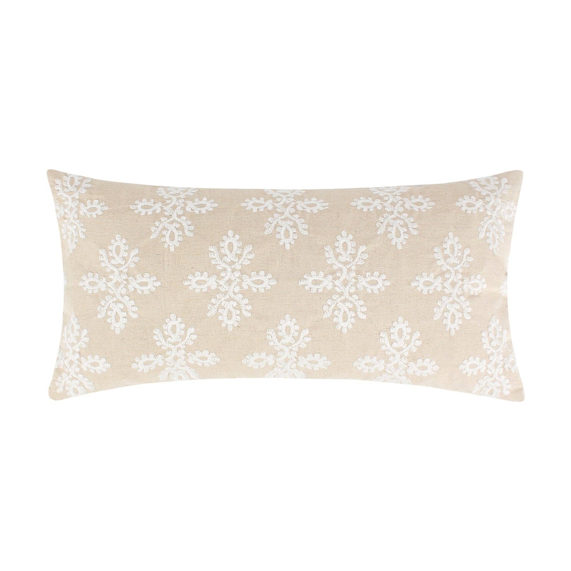 The Diamond Medallions decorative pillow matches perfectly with the Levtex Home Assisi bedding collection. This pillow is sized at 12x24in. and features intricately embroidered cream diamond medallions on a beige ground. The beige and cream color palette makes this a versatile accessory for your bed, couch or favorite chair. The pillow comes pre-filled with a soft, luxurious feather inner.