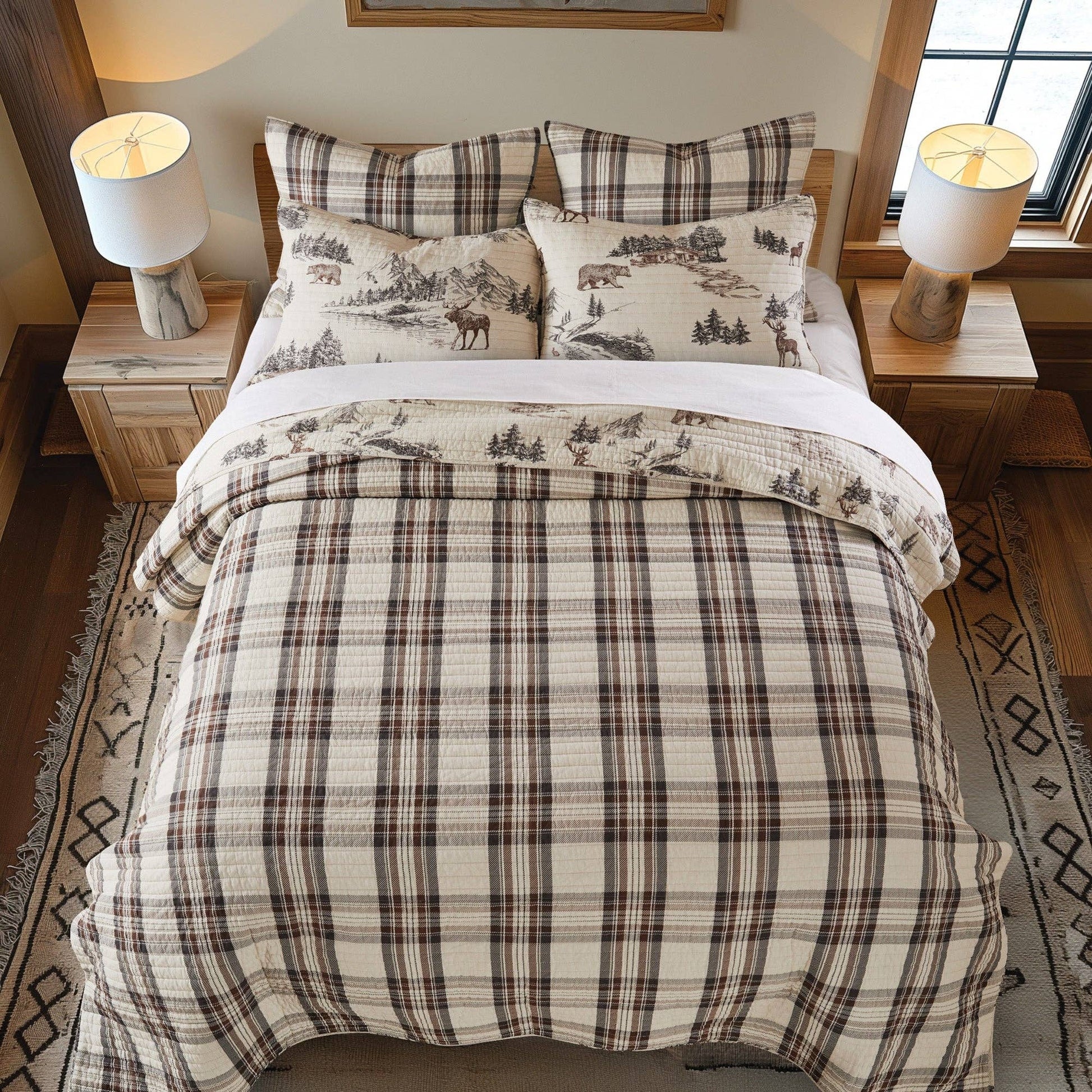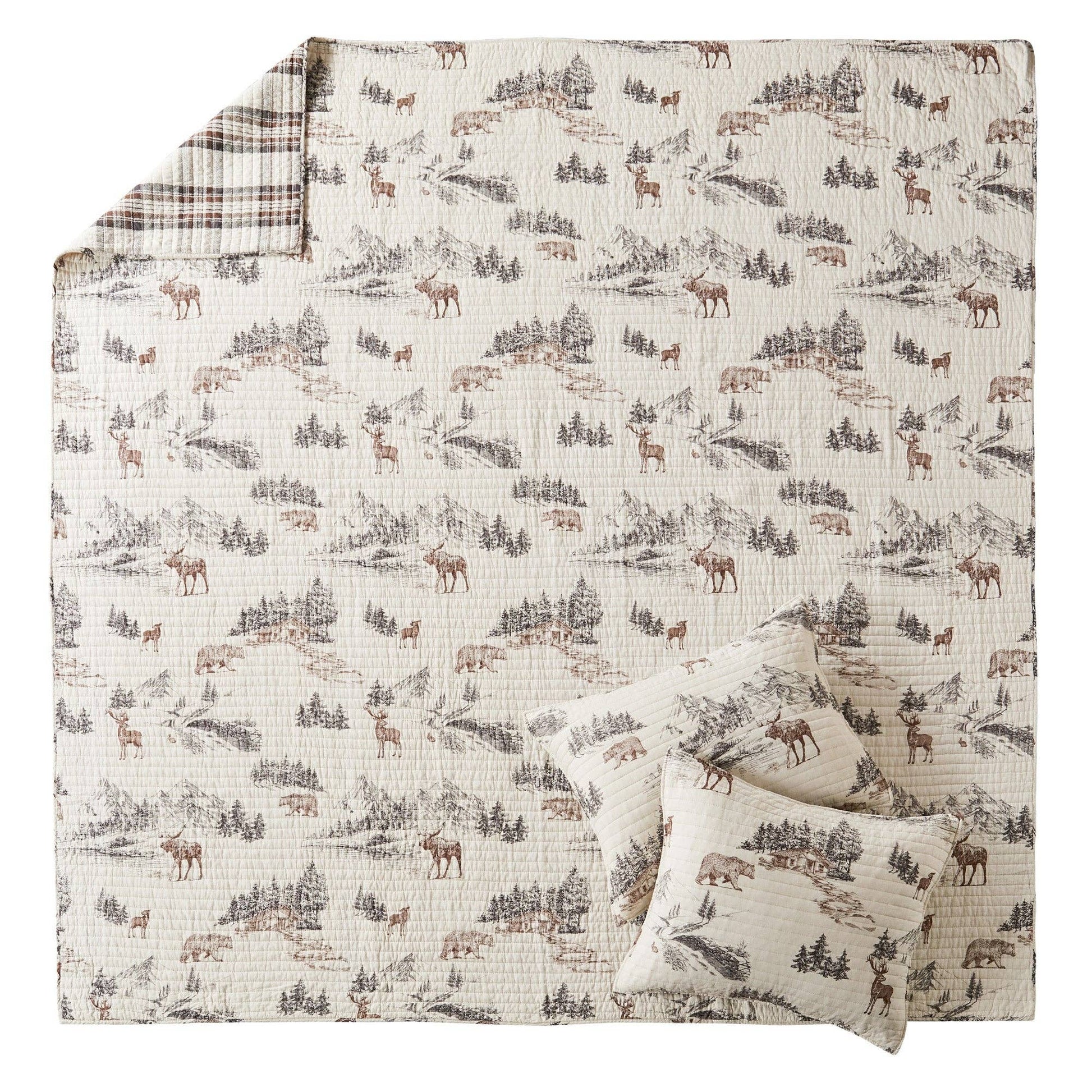 The Lodge Toile Reversible Quilt Set by Levtex Home is inspired by the serene and rustic nature of a mountain get away. Offered in brown, cream and charcoal, this design will immediately transform your bedroom. This reversible quilt features moose and bears strolling in the mountains on the front, reversing to a brown cream and charcoal tartan plaid on the back. The Quilt set has a cotton front and back, filled with a cotton-rich filler, and are machine washable. Enjoy this for years to come!