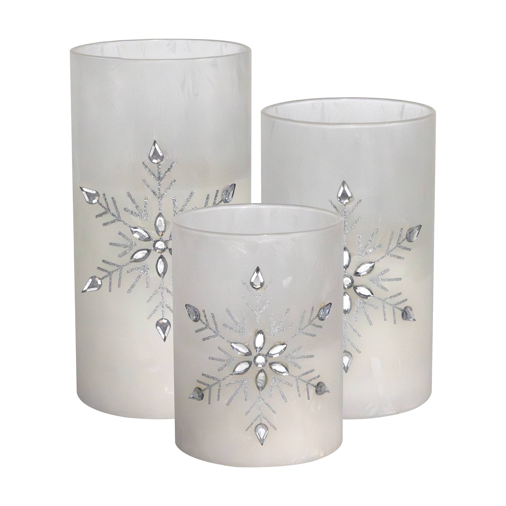 - Set of Three Flameless Glass Hurricane Candles with a Silver Snowflake Design
