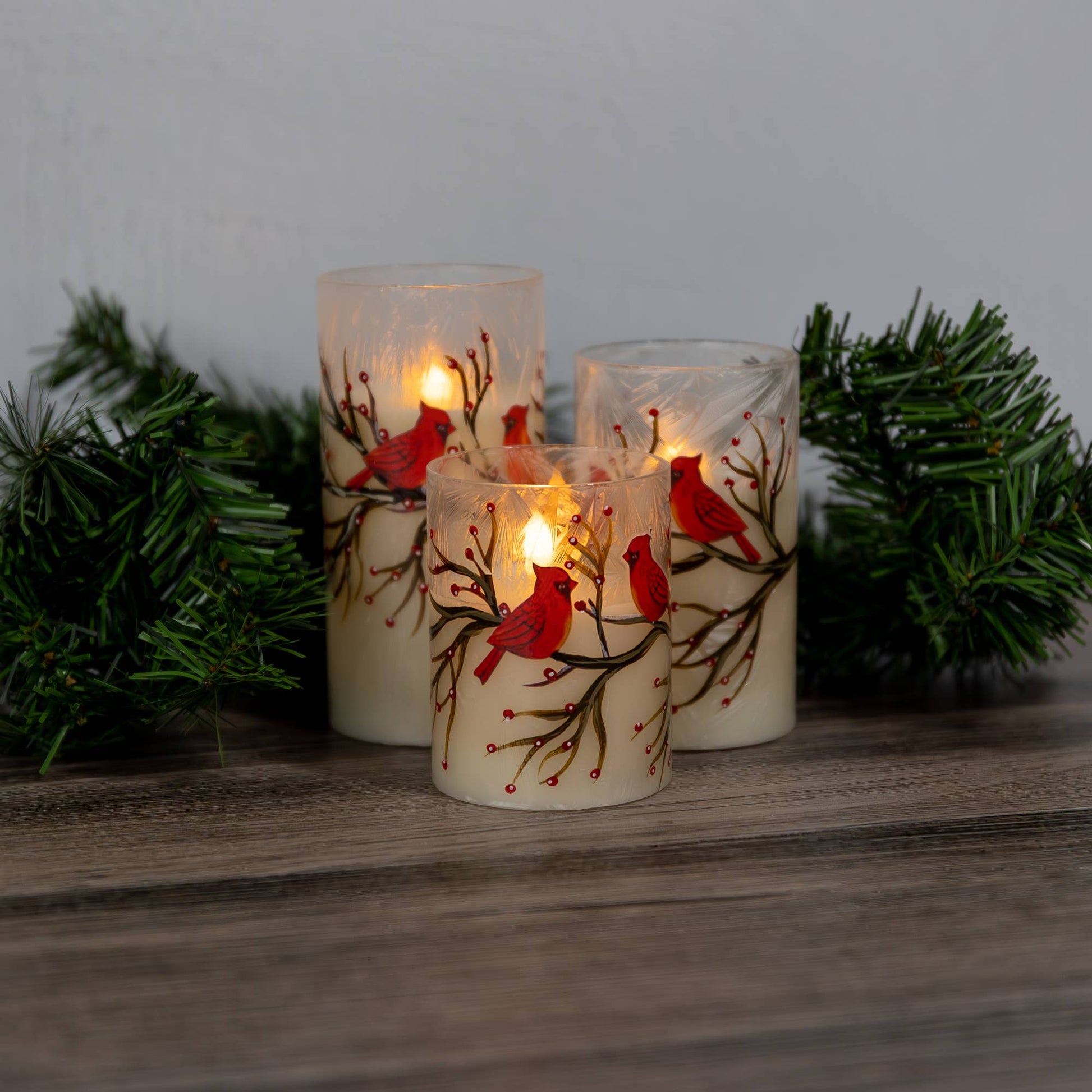- Set of Three Flameless Candles with a Red Cardinal Design