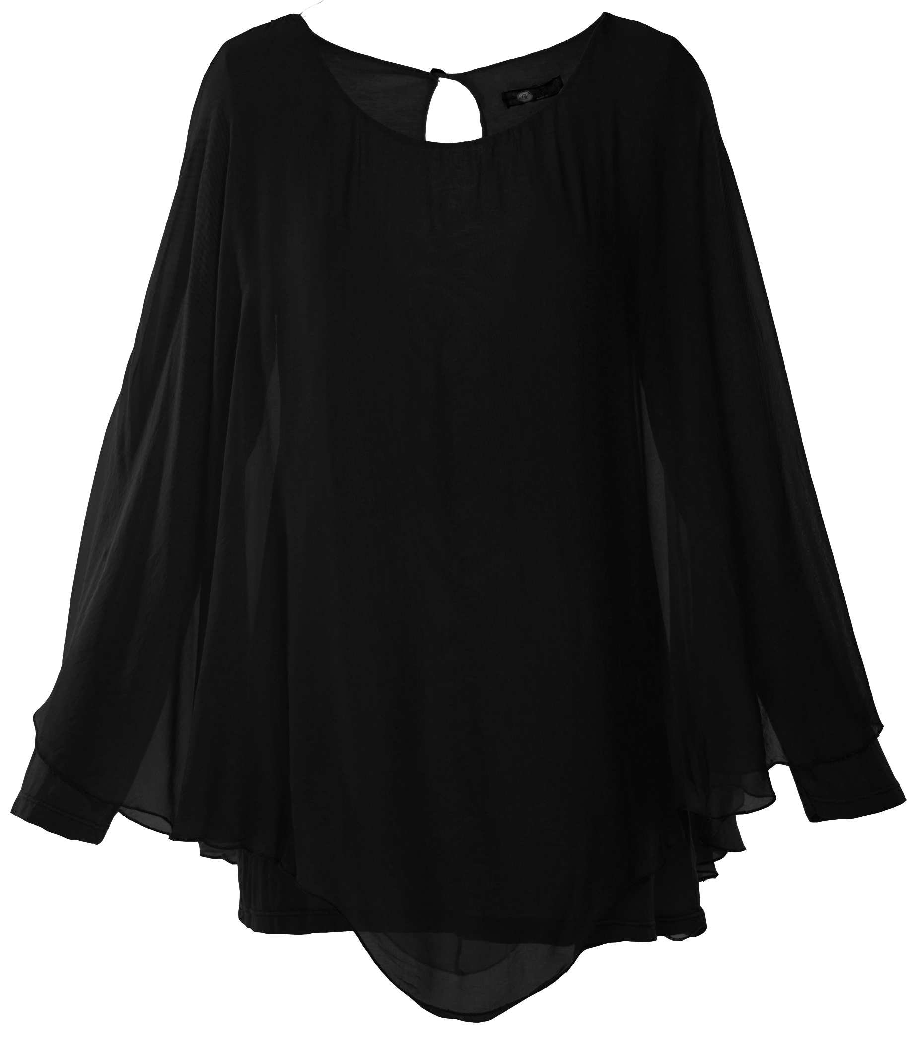 M Made In Italy - Long Sleeve Layered Silk Cape Top Plus Size: Black / 2X