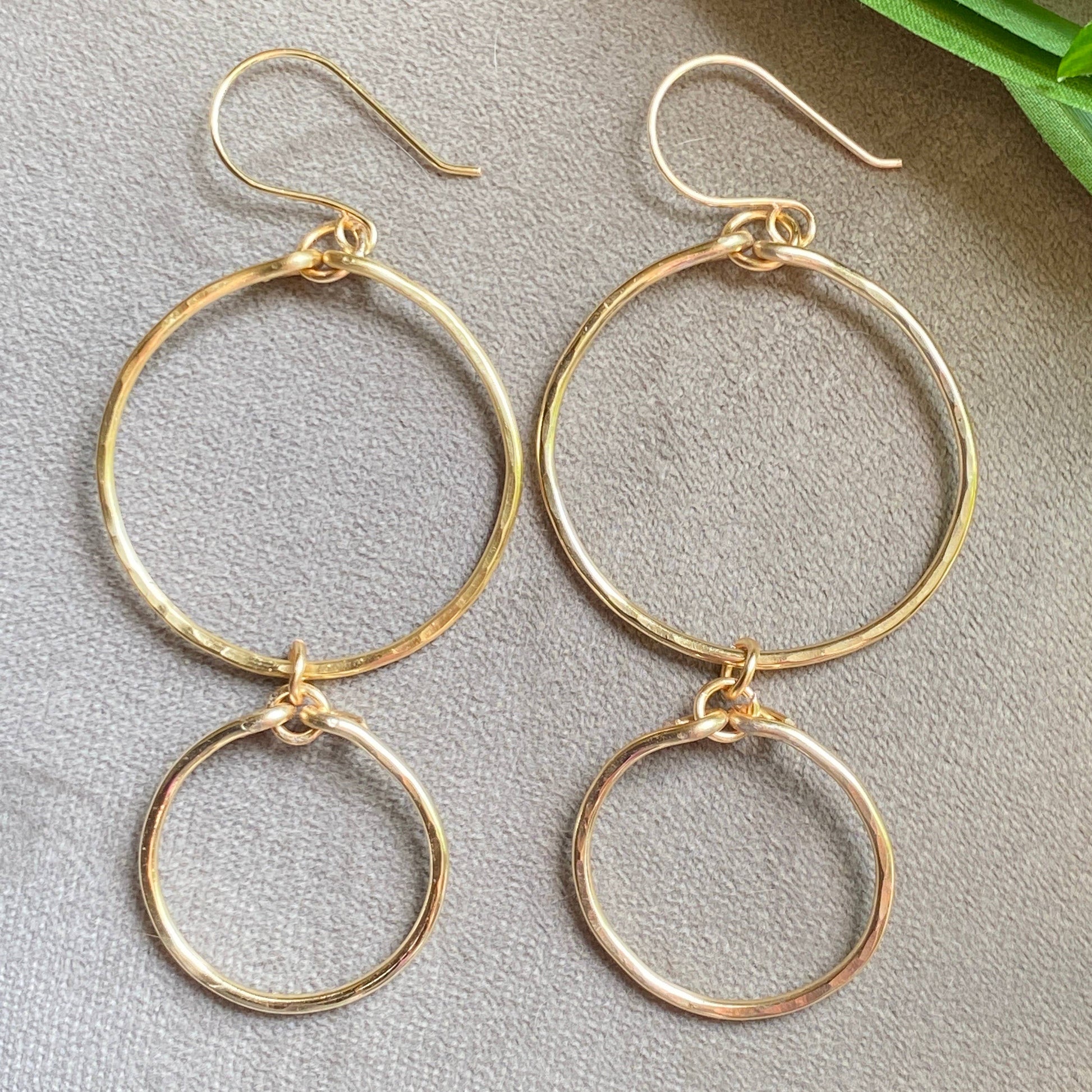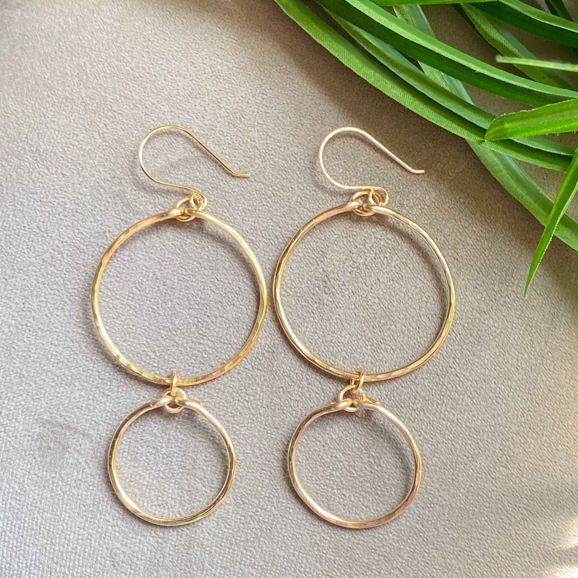 Handmade Hammered double hoop earrings. They are hand forged and hammered, gold plated with handmade gold plated tarnish resistant wire. They measure 3" in length. Really fun Boho look that stands out.