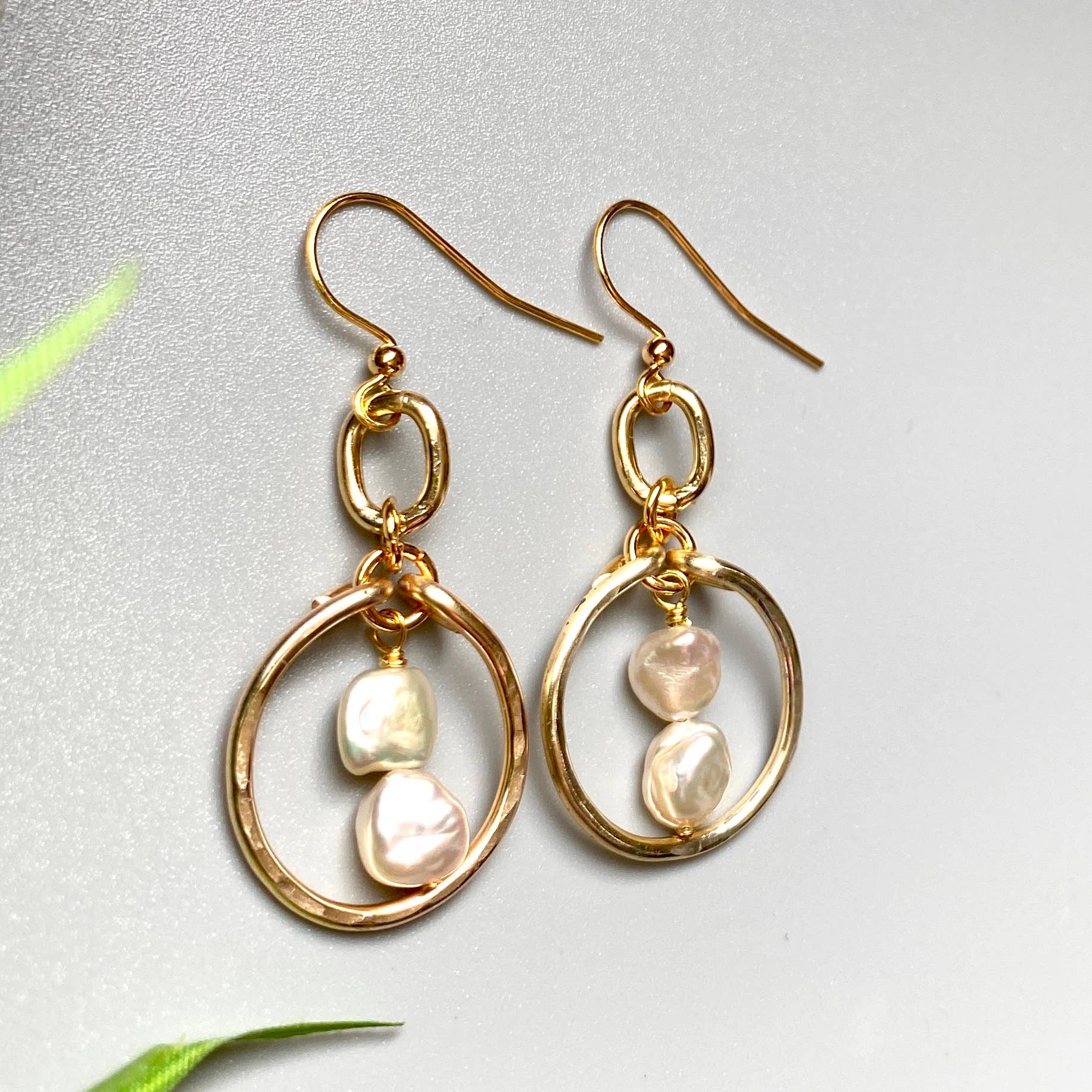 Hand forged and hammered gold hoop earrings using tarnish resistant gold wire with small gold connector. Grade A freshwater pearls, 2 stacked dangle. Simple, elegant, perfect for every day wear. gold plated fishhook ear wires. 1 3/4" drop, including ear wire.