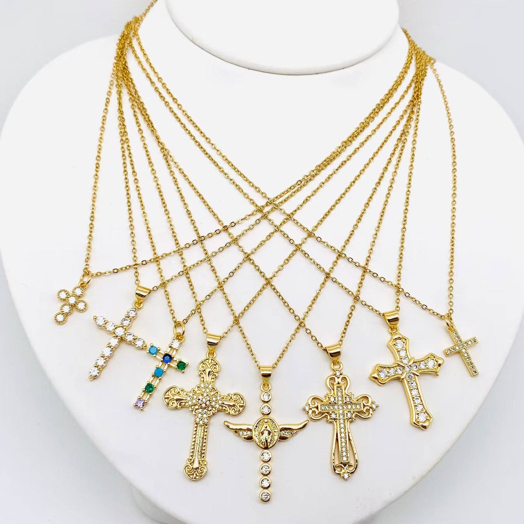 This exquisite piece showcases various cross designs, each adorned with sparkling cubic zirconia stones, creating a dazzling display of faith and style.