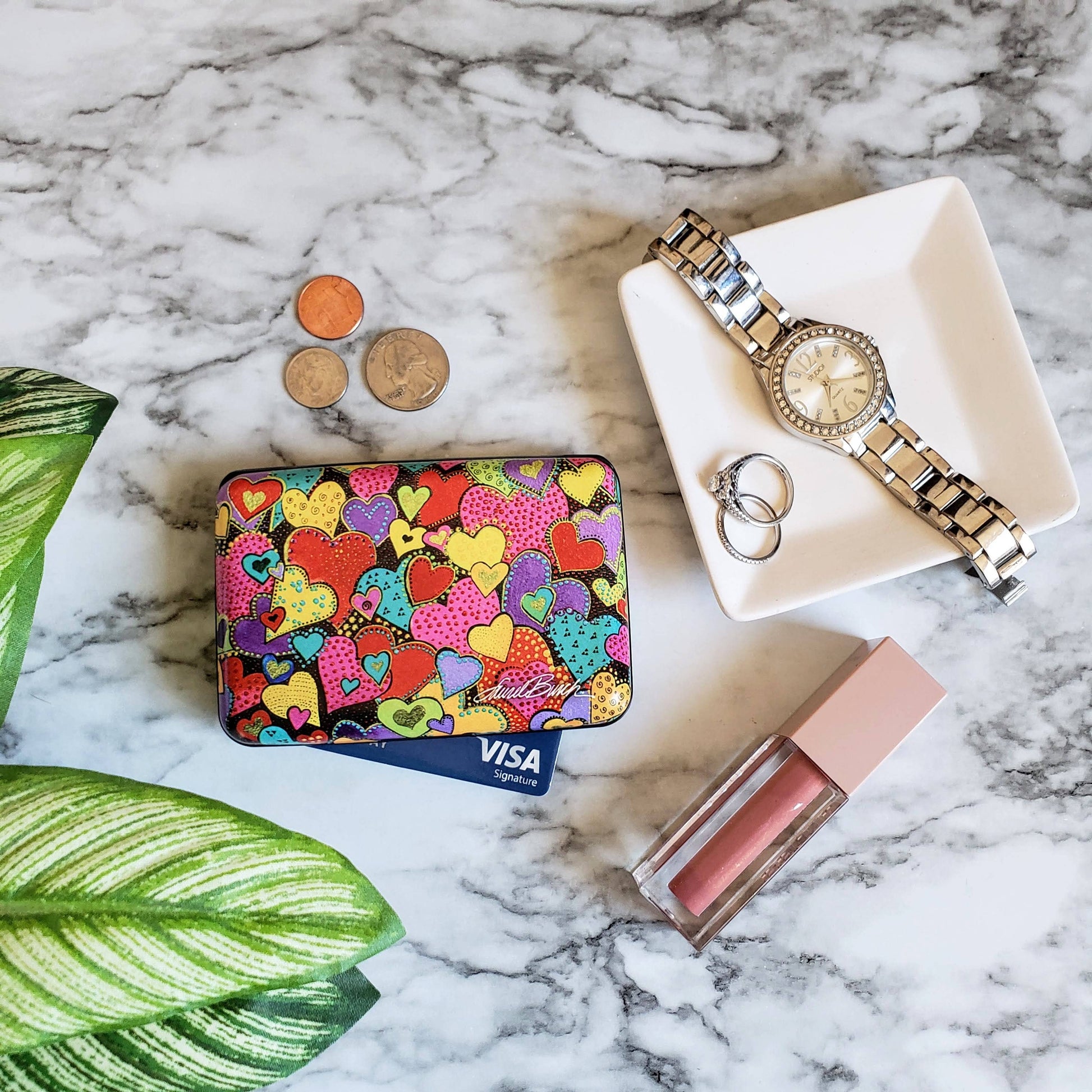 Laurel Burch Dancing Hearts Armored Wallet is a sturdy aluminum wallet featuring a strong closing clasp and a tear resistant fabric interior accordion that holds up to 6 personal cards. The RFID blocking technology will protect against identity theft.