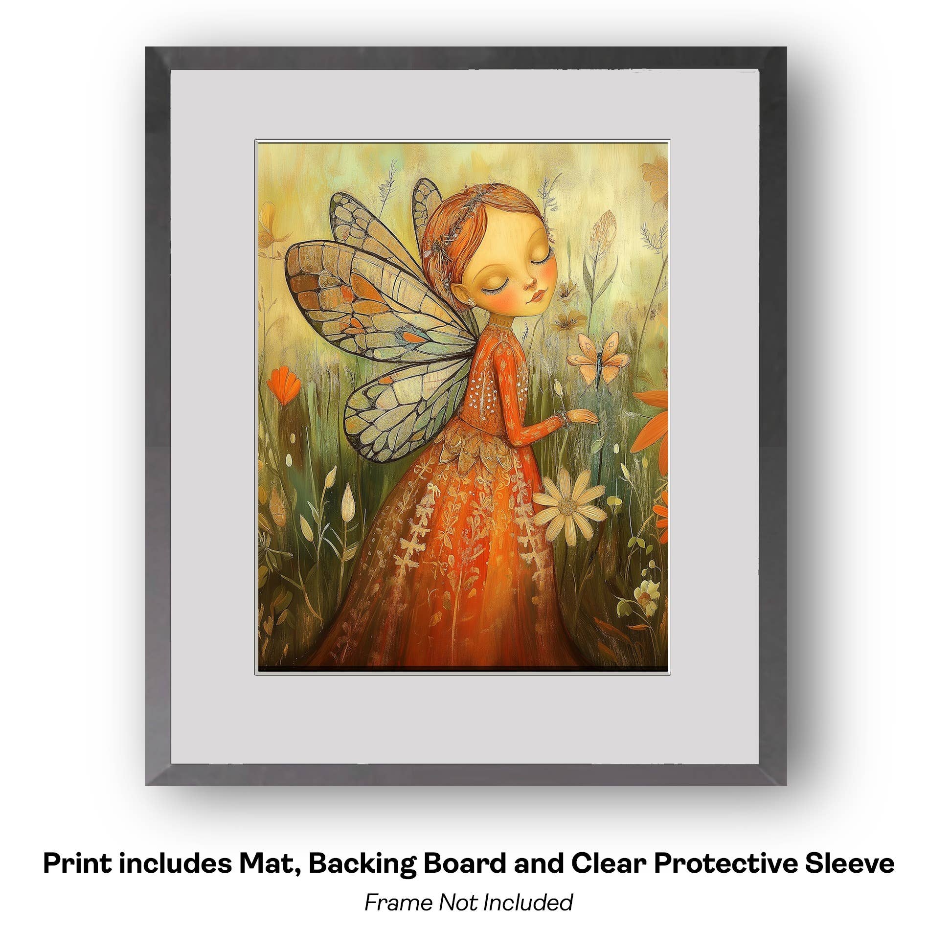 Mowbi - Folk Art Twin Fairies Turquoise Garden - Fairy Folk Art Prints – 8″x10″ Artwork in 11″x14″ Mat