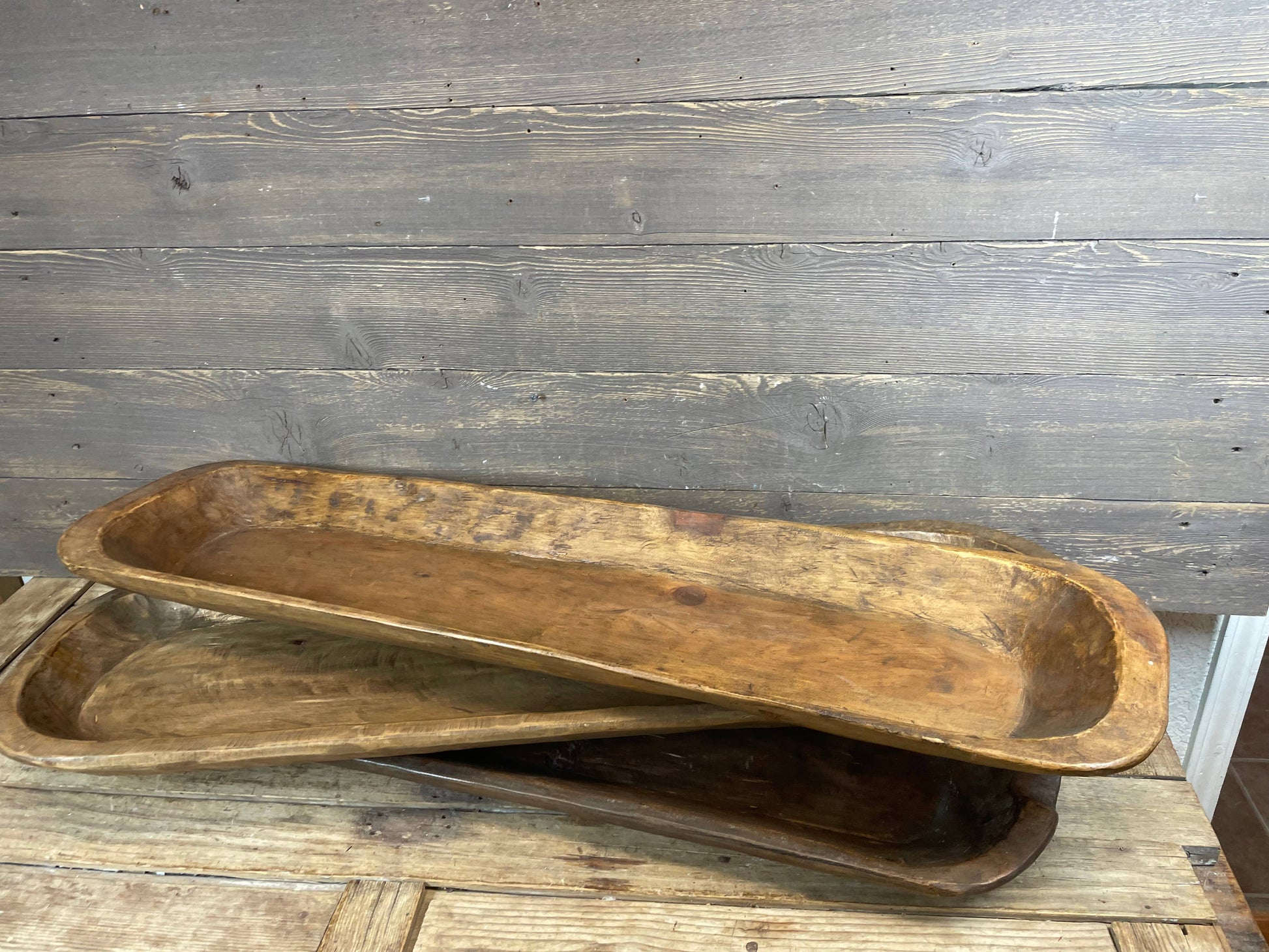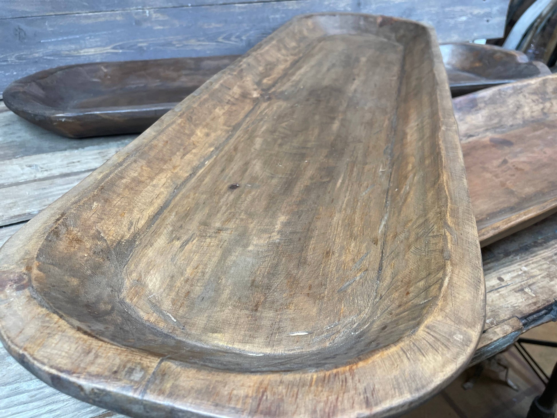 Hand carved, these rustic wooden dough bowls measure about 10-12 x 38-40x2 inch.