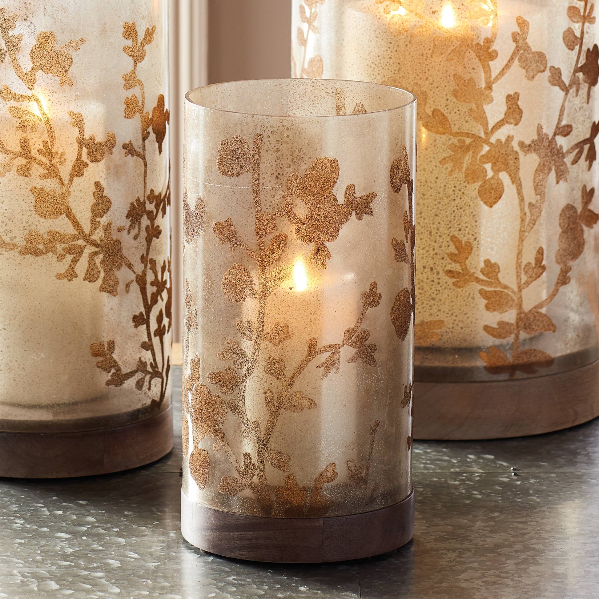 A flowing vine motif twists and turns around speckled, smoky glass. This simple hurricane sits atop a gray turned wood Base. A beautiful accent for home or office. Color: Antique Print/Natural. Candle not included. Interior use. Clean with damp cloth. Avoid chemicals that may be harmful to finish. Never leave a burning candle unattended. Use only LED flameless candles when specified.